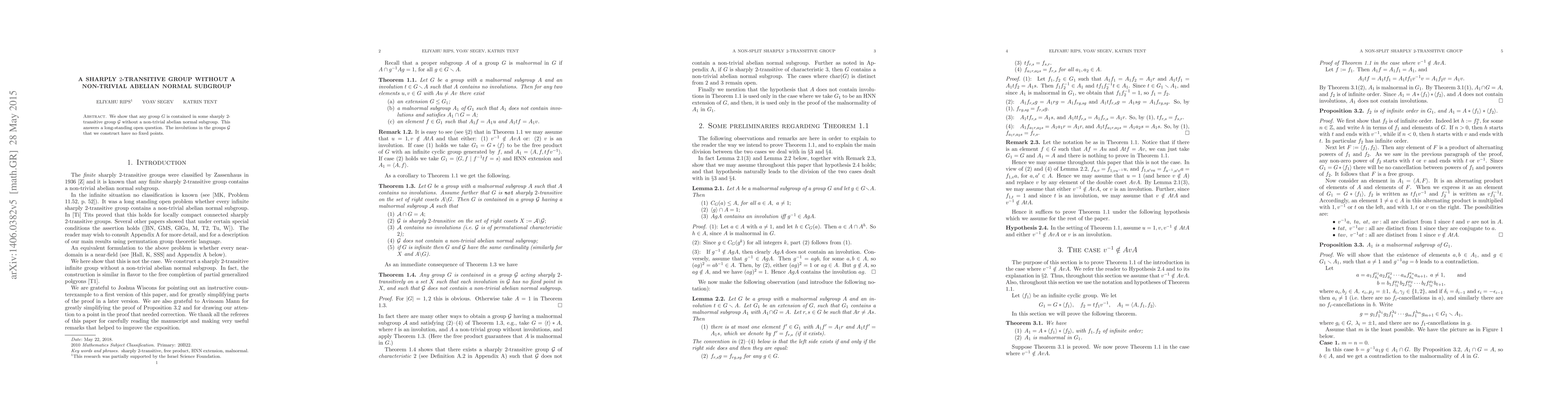 We show that any group $G$ is contained in some sharply 2-transitive group $\mathcal{G}$ without a non-trivial abelian normal subgroup. This answers a long-standing open question. The involutions in the groups $\mathcal{G}$ that we construct have no fixed points.