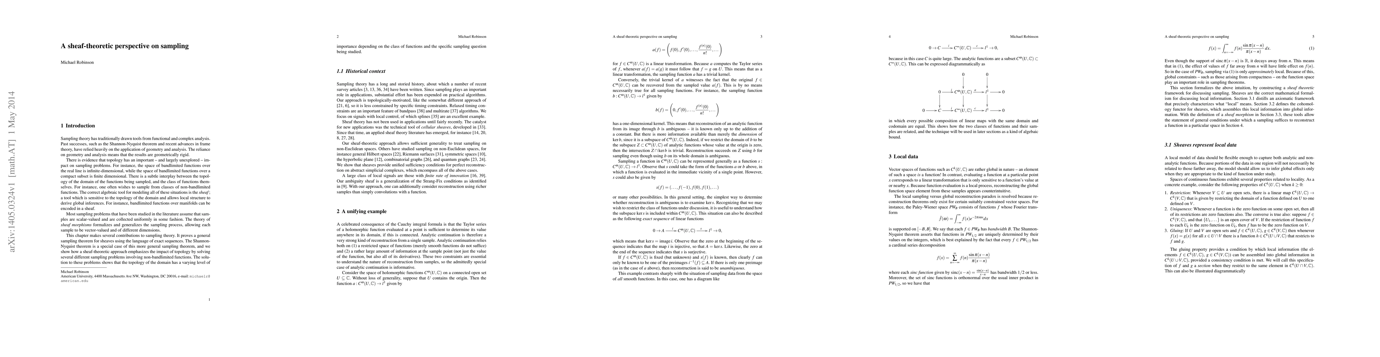 Sampling theory has traditionally drawn tools from functional and complex analysis. Past successes, such as the Shannon-Nyquist theorem and recent advances in frame theory, have relied heavily on the application of geometry and analysis. The reliance on geometry and analysis means that the results are geometrically rigid. There is a subtle interplay between the topology of the domain of the functions being sampled, and the class of functions themselves. Bandlimited functions are somewhat limiting; often one wishes to sample from other classes of functions. The correct topological tool for modeling all of these situations is the sheaf; a tool which allows local structure and consistency to derive global inferences. This chapter develops a general sampling theory for sheaves using the language of exact sequences, recovering the Shannon-Nyquist theorem as a special case. It presents sheaf-theoretic approach by solving several different sampling problems involving non-bandlimited functions. The solution to these problems show that the topology of the domain has a varying level of importance depending on the class of functions and the specific sampling question being studied.