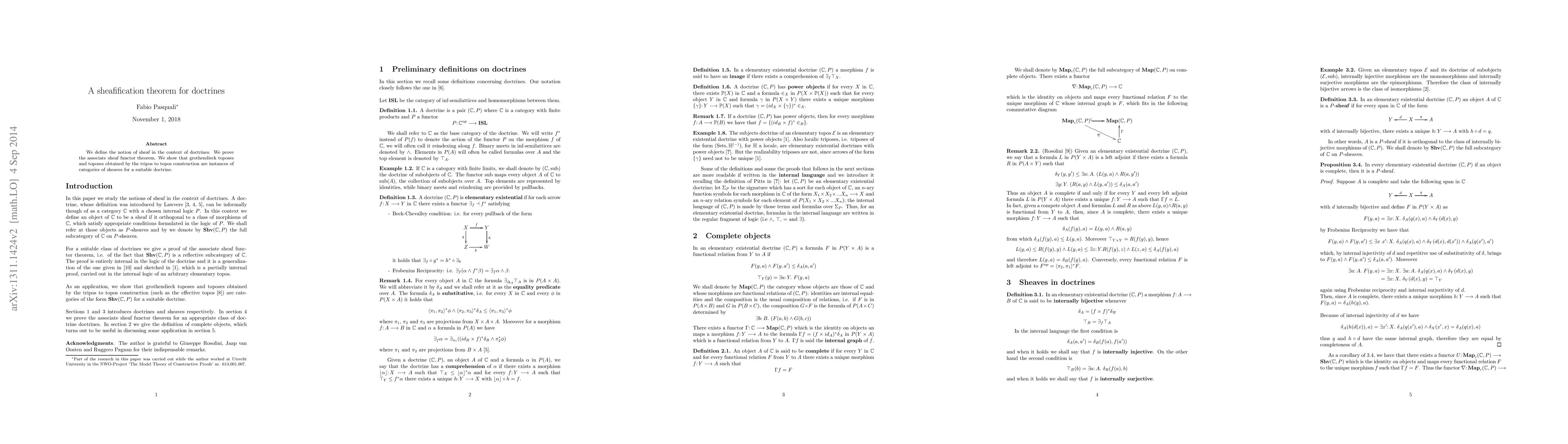This paper introduces the concept of sheaves within the framework of doctrines, proving the associated sheaf functor theorem. It demonstrates that Grothendieck toposes and toposes derived from the tripos to topos construction are examples of categories of sheaves for a specific doctrine.