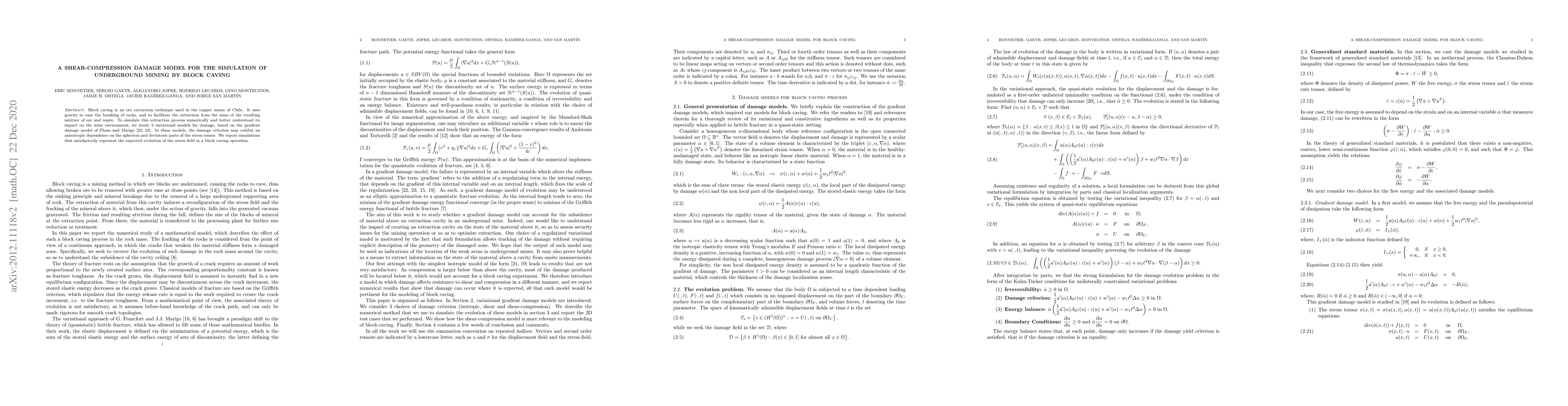 Block caving is an ore extraction technique used in the copper mines of Chile. It uses gravity to ease the breaking of rocks, and to facilitate the extraction from the mine of the resulting mixture of ore and waste. To simulate this extraction process numerically and better understand its impact on the mine environment, we study 3 variational models for damage, based on the gradient damage model of Pham and Marigo (2010). In these models, the damage criterion may exhibit an anisotropic dependence on the spherical and deviatoric parts of the stress tensor. We report simulations that satisfactorily represent the expected evolution of the stress field in a block caving operation.