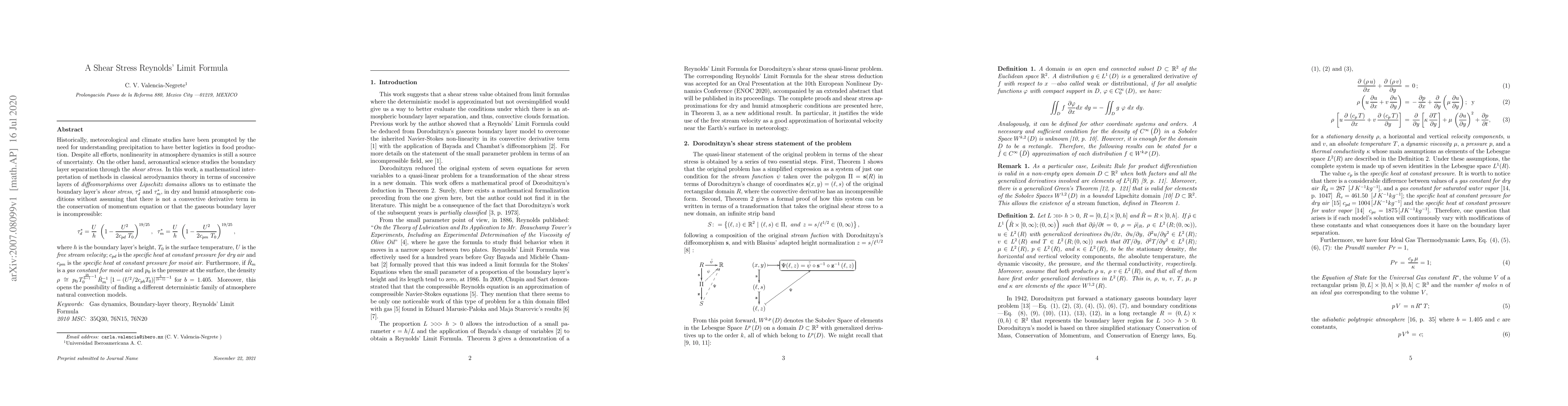 Historically, meteorological and climate studies have been prompted by the need for understanding precipitation to have better logistics in food production. Despite all efforts, nonlinearity in atmosphere dynamics is still a source of uncertainty. On the other hand, aeronautical science studies the boundary layer separation through the \emph{shear stress}. In this work, a mathematical interpretation of methods in classical aerodynamics theory in terms of successive layers of \emph{diffeomorphisms} over \emph{Lipschitz domains} allows us to estimate the boundary layer's \emph{shear stress}, $\tau^{*}_d$ and $\tau^{*}_m$, in dry and humid atmospheric conditions without assuming that there is not a convective derivative term in the conservation of momentum equation or that the gaseous boundary layer is incompressible: \[ \tau^{*}_d = \frac{U}{h}\ \left(1-\frac{U^2}{2c_{pd}\ T_0}\right)^{19/25}, \hspace{7pt} \tau^{*}_m = \frac{U}{h}\ \left(1-\frac{U^2}{2c_{pm}\ T_0}\right)^{19/25},\] where $h$ is the boundary layer's height, $T_0$ is the surface temperature, $U$ is the \emph{free stream velocity}; $c_{pd}$ is the \emph{specific heat at constant pressure for dry air} and $c_{pm}$ is the \emph{specific heat at constant pressure for moist air}. Furthermore, if $\hat{R}_m$ is a \emph{gas constant for moist air} and $p_0$ is the pressure at the surface, the density $\rho \hspace{2pt} \cong \hspace{2pt} p_0 \hspace{2pt} T_0^{\frac{2b}{b-1}-1} \hspace{2pt} \hat{R}_{m}^{-1} \hspace{2pt} \left[1-\left(U^2/2c_{ph}T_0\right)\right]^{\frac{b}{(b-1)}-1}$ for $b=1.405$. Moreover, this opens the possibility of finding a different deterministic family of atmosphere natural convection models.