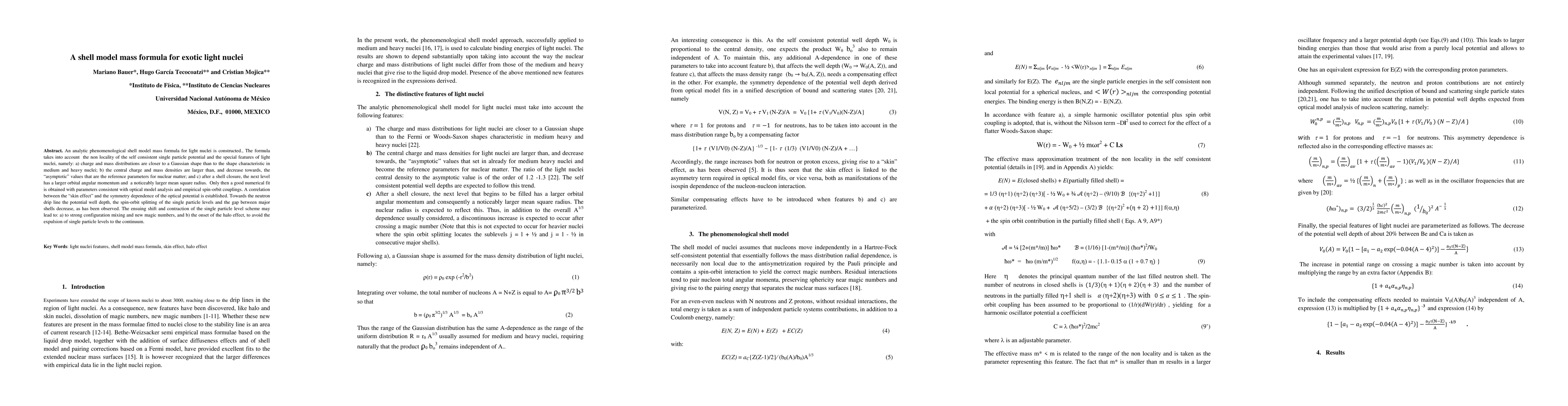 This paper constructs an analytic shell model mass formula for light nuclei, emphasizing the Gaussian-like charge and mass distributions, higher central densities, and the increased orbital angular momentum post-shell closure. The model correlates the "skin effect" with optical potential symmetry dependence and predicts phenomena like configuration mixing, new magic numbers, and the halo effect near the neutron drip line.