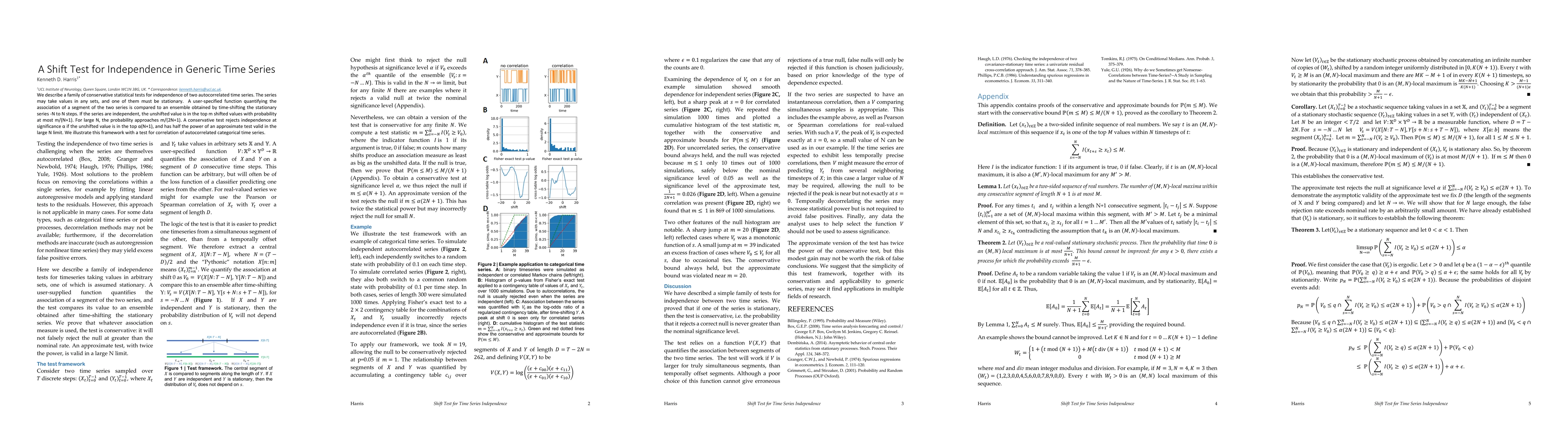 We describe a family of conservative statistical tests for independence of two autocorrelated time series. The series may take values in any sets, and one of them must be stationary. A user-specified function quantifying the association of a segment of the two series is compared to an ensemble obtained by time-shifting the stationary series -N to N steps. If the series are independent, the unshifted value is in the top m shifted values with probability at most m/(N+1). For large N, the probability approaches m/(2N+1). A conservative test rejects independence at significance {\alpha} if the unshifted value is in the top {\alpha}(N+1), and has half the power of an approximate test valid in the large N limit. We illustrate this framework with a test for correlation of autocorrelated categorical time series.
