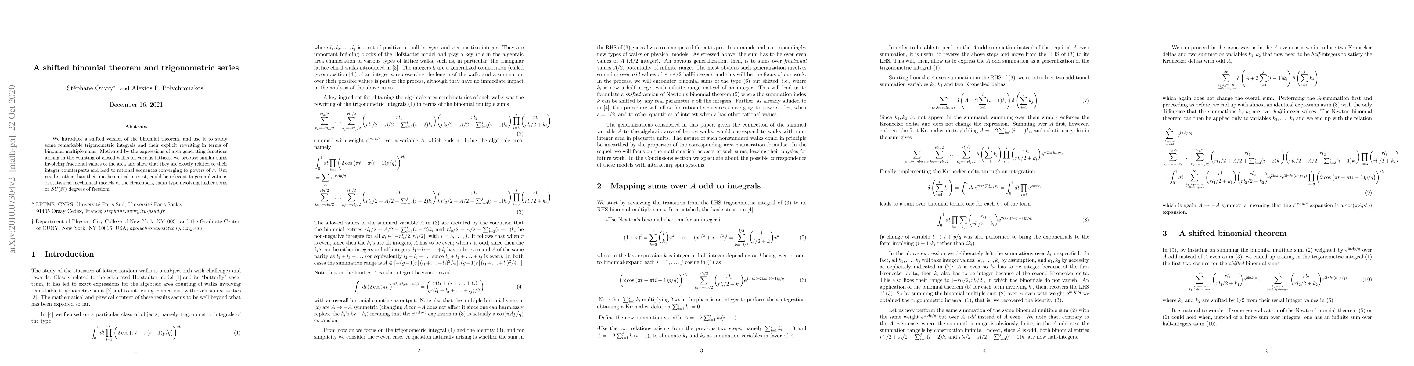 This paper presents a shifted binomial theorem and applies it to derive trigonometric integrals expressed as binomial multiple sums. It explores fractional area generating functions related to lattice walks, revealing connections to rational sequences converging to powers of π, with potential implications for higher-spin statistical mechanical models.