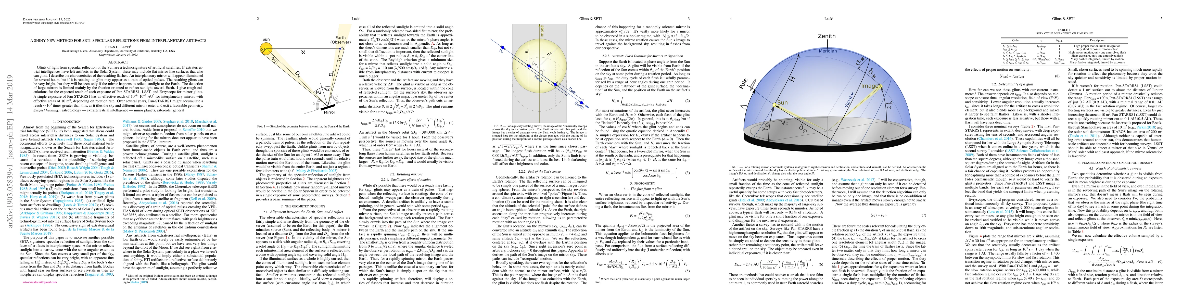 This paper proposes a new method for SETI based on detecting specular reflections from potential extraterrestrial artifacts in the Solar System. The method involves observing glints from rotating mirrors that reflect sunlight towards Earth, which could be detected by telescopes like Pan-STARRS1, LSST, and Evryscope.