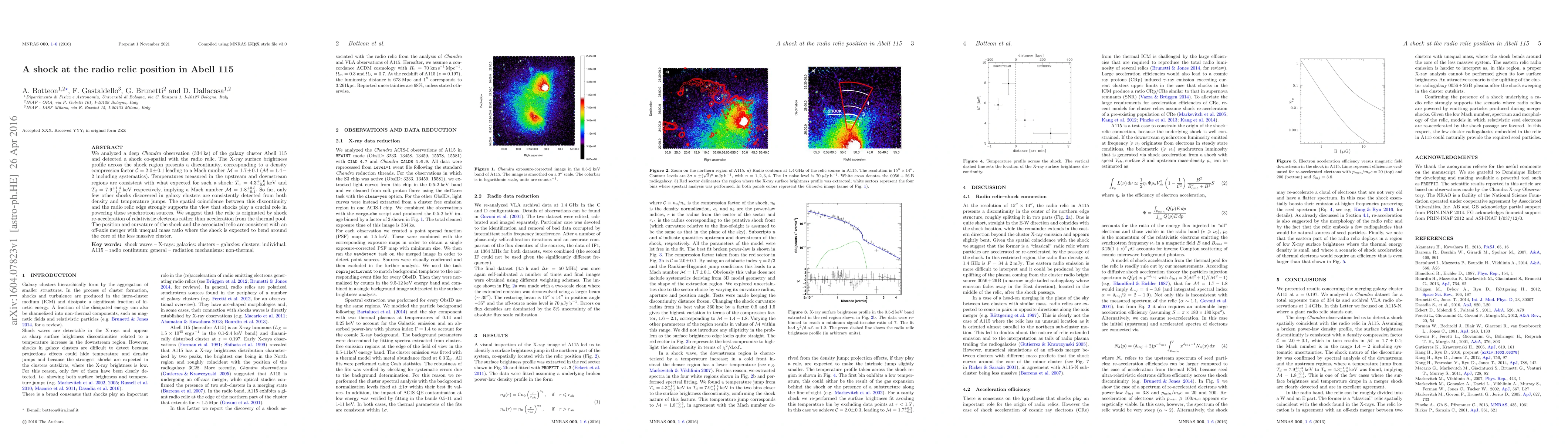We analyzed a deep Chandra observation (334 ks) of the galaxy cluster Abell 115 and detected a shock co-spatial with the radio relic. The X-ray surface brightness profile across the shock region presents a discontinuity, corresponding to a density compression factor $\mathcal{C}=2.0\pm0.1$ leading to a Mach number $\mathcal{M}=1.7\pm0.1$ ($\mathcal{M}=1.4-2$ including systematics). Temperatures measured in the upstream and downstream regions are consistent with what expected for such a shock: $T_u=4.3^{+1.0}_{-0.6}\:\rm{keV}$ and $T_d=7.9^{+1.4}_{-1.1}\:\rm{keV}$ respectively, implying a Mach number $\mathcal{M}=1.8^{+0.5}_{-0.4}$. So far, only few other shocks discovered in galaxy clusters are consistently detected from both density and temperature jumps. The spatial coincidence between this discontinuity and the radio relic edge strongly supports the view that shocks play a crucial role in powering these synchrotron sources. We suggest that the relic is originated by shock re-acceleration of relativistic electrons rather than acceleration from the thermal pool. The position and curvature of the shock and the associated relic are consistent with an off-axis merger with unequal mass ratio where the shock is expected to bend around the core of the less massive cluster.