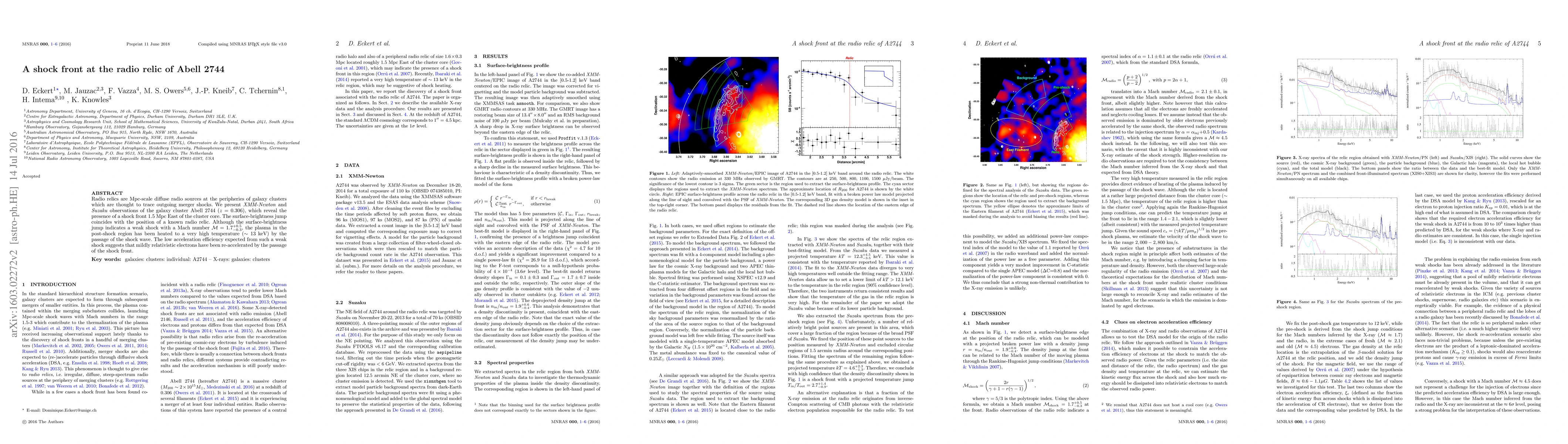 Radio relics are Mpc-scale diffuse radio sources at the peripheries of galaxy clusters which are thought to trace outgoing merger shocks. We present XMM-Newton and Suzaku observations of the galaxy cluster Abell 2744 (z=0.306), which reveal the presence of a shock front 1.5 Mpc East of the cluster core. The surface-brightness jump coincides with the position of a known radio relic. Although the surface-brightness jump indicates a weak shock with a Mach number $\mathcal{M}=1.7_{-0.3}^{+0.5}$, the plasma in the post-shock region has been heated to a very high temperature ($\sim13$ keV) by the passage of the shock wave. The low acceleration efficiency expected from such a weak shock suggests that mildly relativistic electrons have been re-accelerated by the passage of the shock front.