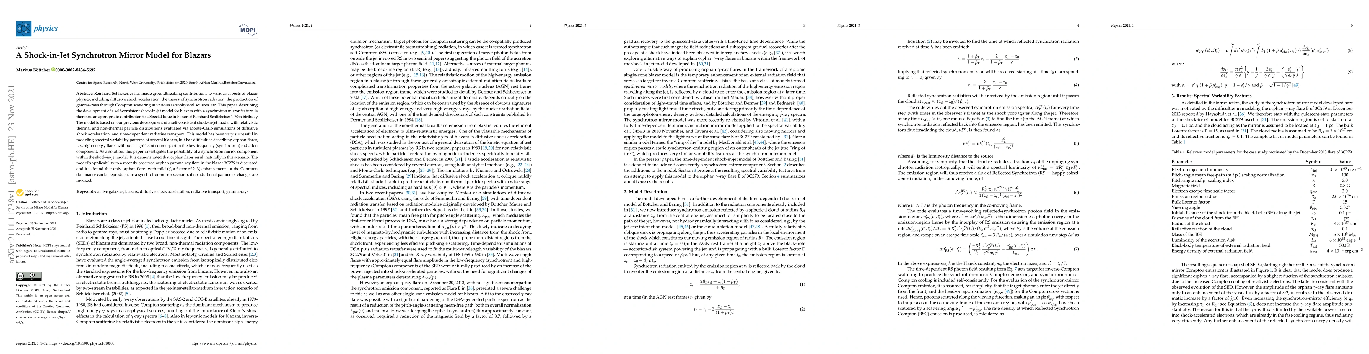 Reinhard Schlickeiser has made groundbreaking contributions to various aspects of blazar physics, including diffusive shock acceleration, the theory of synchrotron radiation, the production of gamma-rays through Compton scattering in various astrophysical sources, etc. This paper, describing the development of a self-consistent shock-in-jet model for blazars with a synchrotron mirror feature, is therefore an appropriate contribution to a Special Issue in honor of Reinhard Schlickeiser's 70th birthday. The model is based on our previous development of a self-consistent shock-in-jet model with relativistic thermal and non-thermal particle distributions evaluated via Monte-Carlo simulations of diffusive shock acceleration, and time-dependent radiative transport. This model has been very successful in modeling spectral variability patterns of several blazars, but has difficulties describing orphan flares, i.e., high-energy flares without a significant counterpart in the low-frequency (synchrotron) radiation component. As a solution, this paper investigates the possibility of a synchrotron mirror component within the shock-in-jet model. It is demonstrated that orphan flares result naturally in this scenario. The model's applicability to a recently observed orphan gamma-ray flare in the blazar 3C279 is discussed and it is found that only orphan flares with mild ($\lesssim$ a factor of 2 - 3) enhancements of the Compton dominance can be reproduced in a synchrotron-mirror scenario, if no additional parameter changes are invoked.