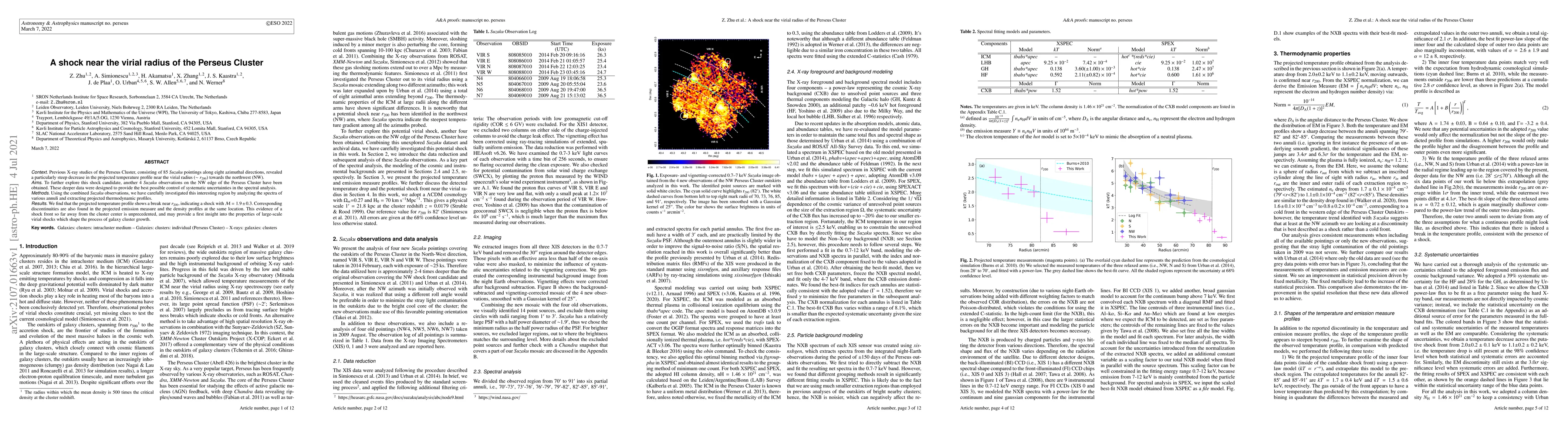 The Perseus Cluster exhibits a shock near its virial radius, as evidenced by a steep temperature drop and discontinuities in emission measure and density profiles, suggesting a shock with a Mach number of 1.9±0.3. This discovery provides unprecedented insight into large-scale virial shocks influencing galaxy cluster growth.