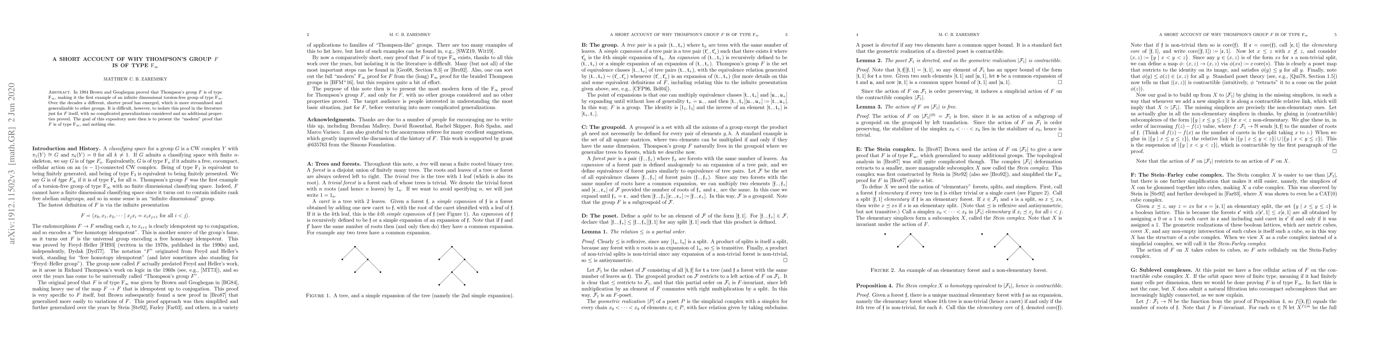 In 1984 Brown and Geoghegan proved that Thompson's group $F$ is of type $\textrm{F}_\infty$, making it the first example of an infinite dimensional torsion-free group of type $\textrm{F}_\infty$. Over the decades a different, shorter proof has emerged, which is more streamlined and generalizable to other groups. It is difficult, however, to isolate this proof in the literature just for $F$ itself, with no complicated generalizations considered and no additional properties proved. The goal of this expository note then is to present the "modern" proof that $F$ is of type $\textrm{F}_\infty$, and nothing else.