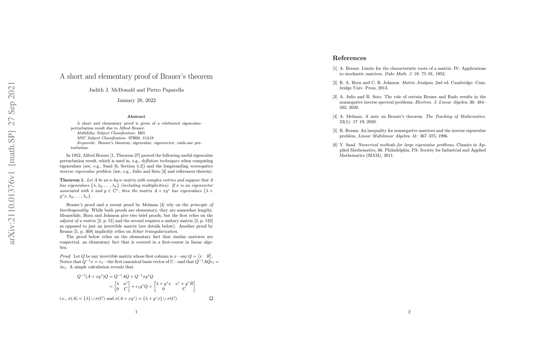 Summary: This paper presents a concise and straightforward proof of Brauer's theorem on eigenvalue perturbation, simplifying the original complex demonstration. The new approach aims to make the result more accessible to a broader audience.
