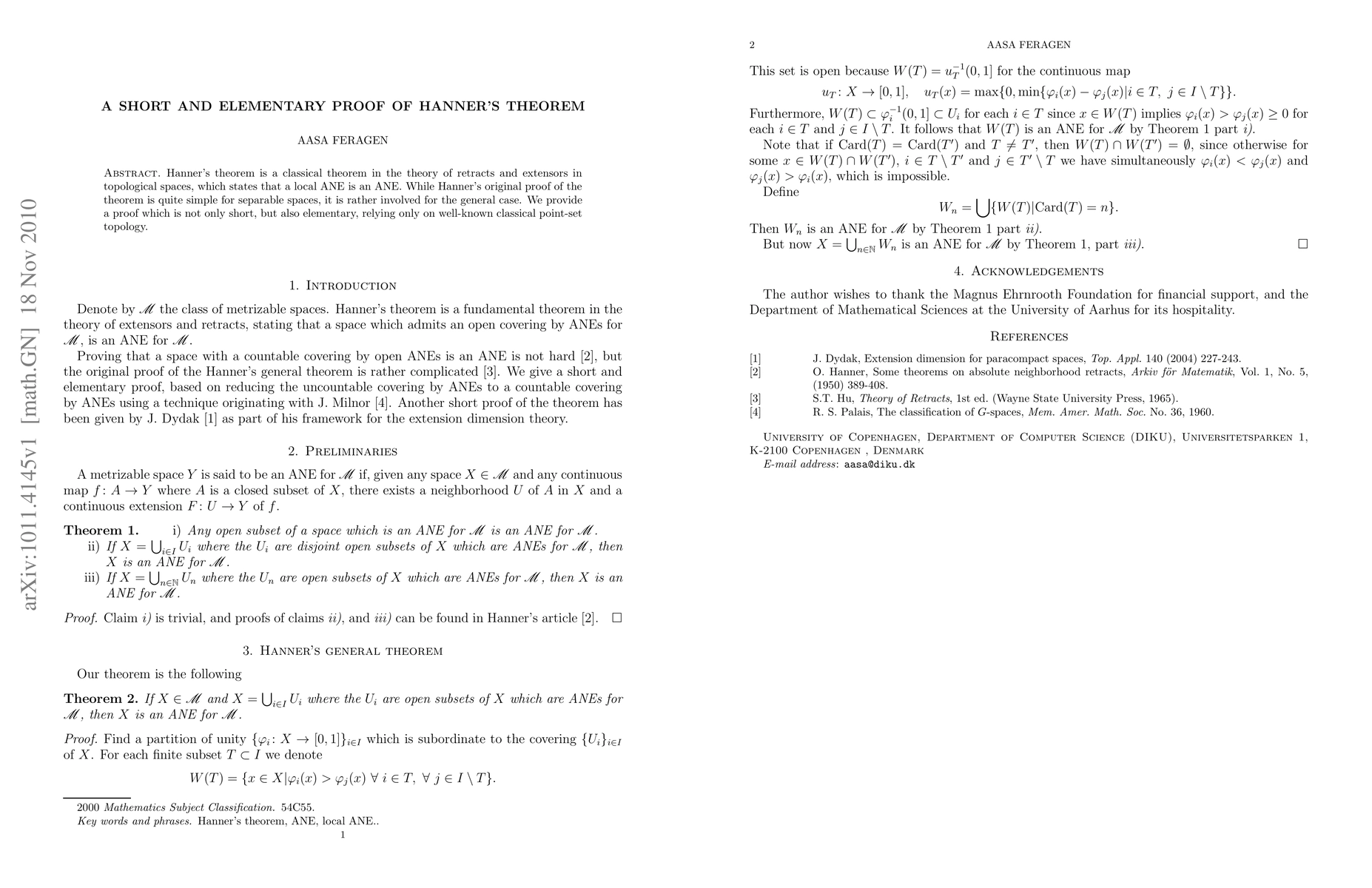 This paper presents a concise and straightforward proof of Hanner's theorem, which asserts that a local ANE (absolute neighborhood extensor) is an ANE, using basic principles from point-set topology. The new proof simplifies the general case beyond Hanner's original method.
