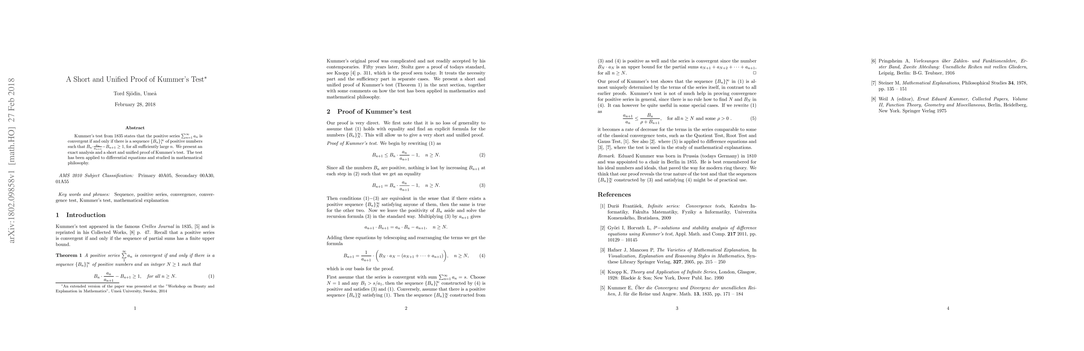 This paper presents a short and unified proof of Kummer's test, which states that a series is convergent if it meets a specific inequality condition for large enough n. The test has implications in differential equations and mathematical philosophy.