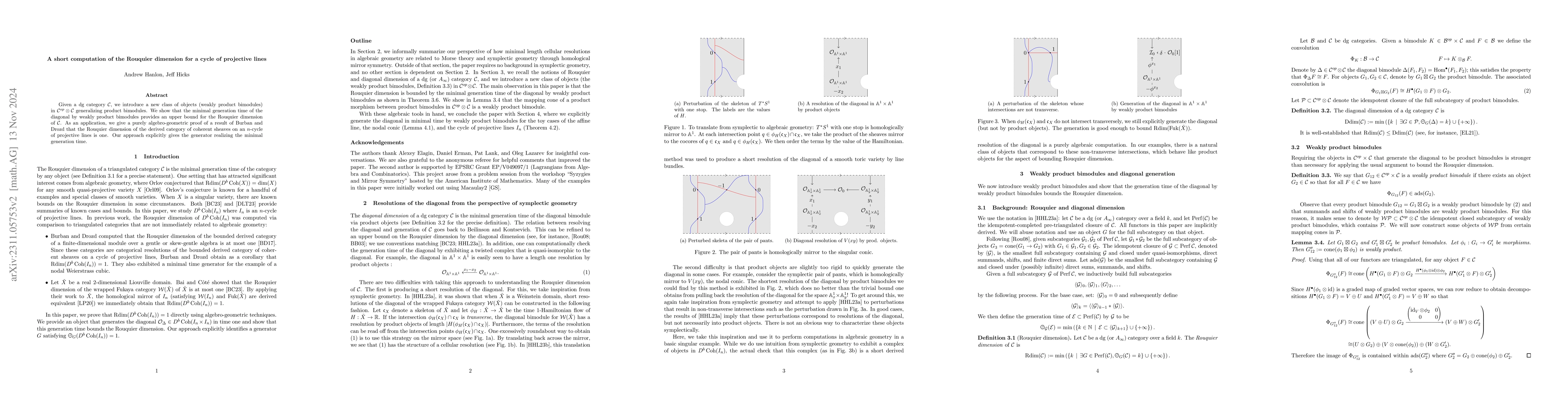 This paper introduces a new class of objects in dg categories and demonstrates that the minimal generation time of the diagonal by these objects bounds the Rouquier dimension. It also provides an algebro-geometric proof for the Rouquier dimension of the derived category of coherent sheaves on an $n$-cycle of projective lines, showing it to be one.