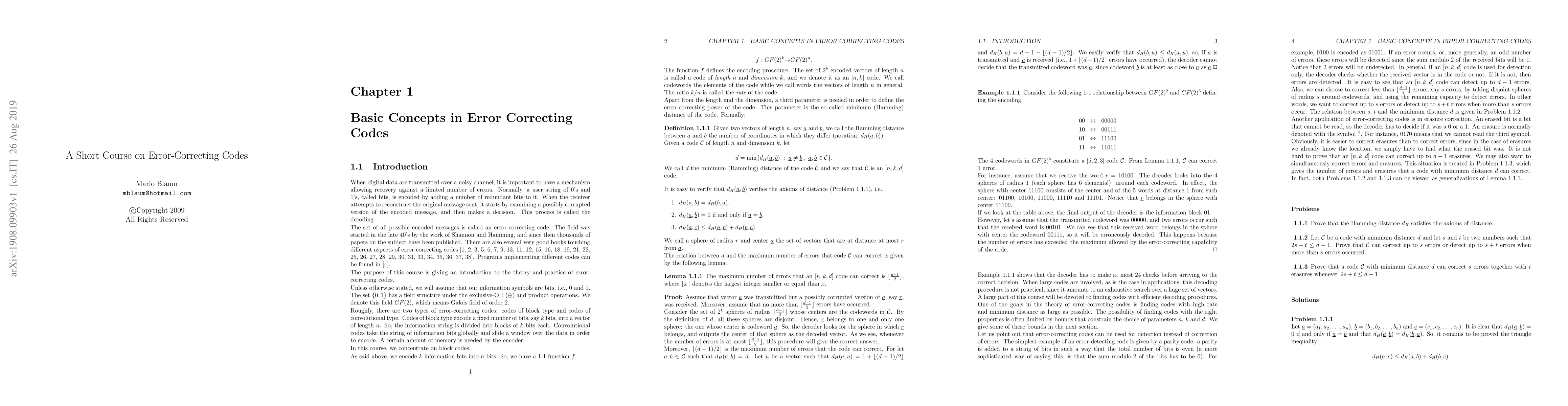 When digital data are transmitted over a noisy channel, it is important to have a mechanism allowing recovery against a limited number of errors. Normally, a user string of 0's and 1's, called bits, is encoded by adding a number of redundant bits to it. When the receiver attempts to reconstruct the original message sent, it starts by examining a possibly corrupted version of the encoded message, and then makes a decision. This process is called the decoding. The purpose of this course is giving an introduction to the theory and practice of error-correcting codes.