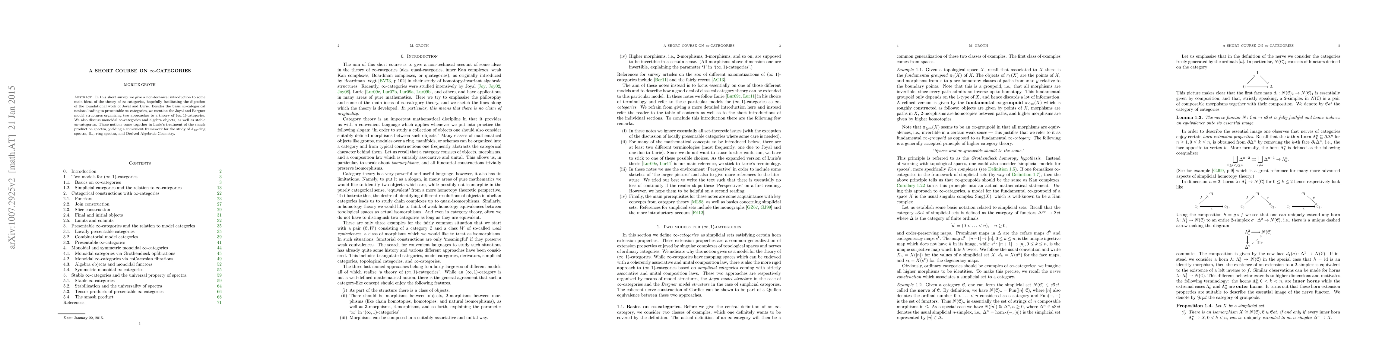 In this short survey we give a non-technical introduction to some main ideas of the theory of $\infty$-categories, hopefully facilitating the digestion of the foundational work of Joyal and Lurie. Besides the basic $\infty$-categorical notions leading to presentable $\infty$-categories, we mention the Joyal and Bergner model structures organizing two approaches to a theory of $(\infty,1)$-categories. We also discuss monoidal $\infty$-categories and algebra objects, as well as stable $\infty$-categories. These notions come together in Lurie's treatment of the smash product on spectra, yielding a convenient framework for the study of $\mathbb{A}_\infty$-ring spectra, $\mathbb{E}_\infty$-ring spectra, and Derived Algebraic Geometry.
