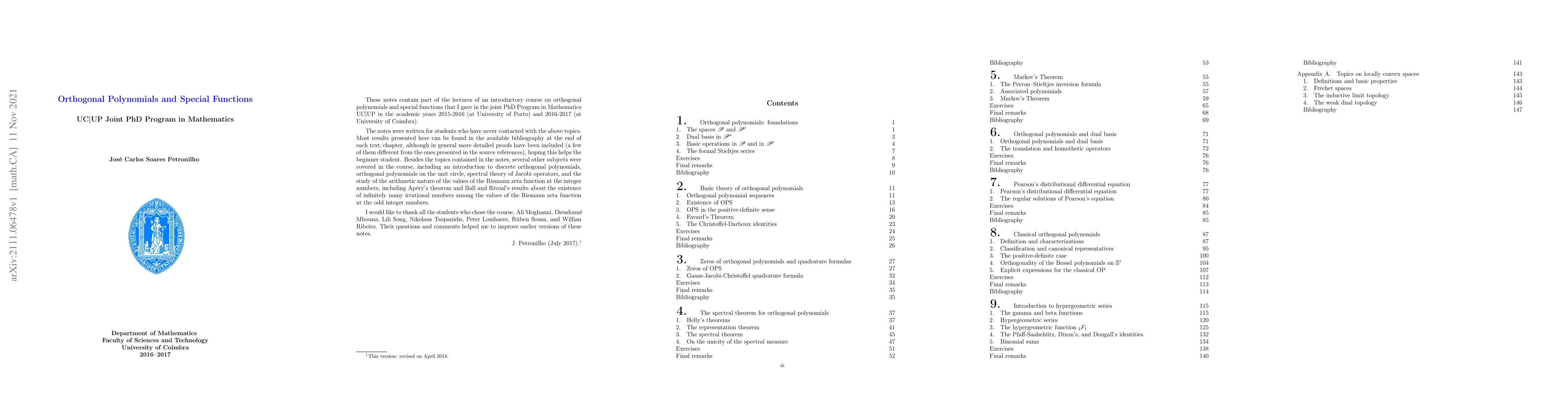 These notes contain part of the lectures of an introductory course on orthogonal polynomials and special functions that I gave in the joint PhD Program in Mathematics UC|UP in the academic years 2015-2016 (at University of Porto) and 2016-2017 (at University of Coimbra). The notes were written for students who have never contacted with the above topics. Most results presented here can be found in the available bibliography at the end of each text/chapter, although in general more detailed proofs have been included (a few of them different from the ones presented in the source references), hoping this helps the beginner student.