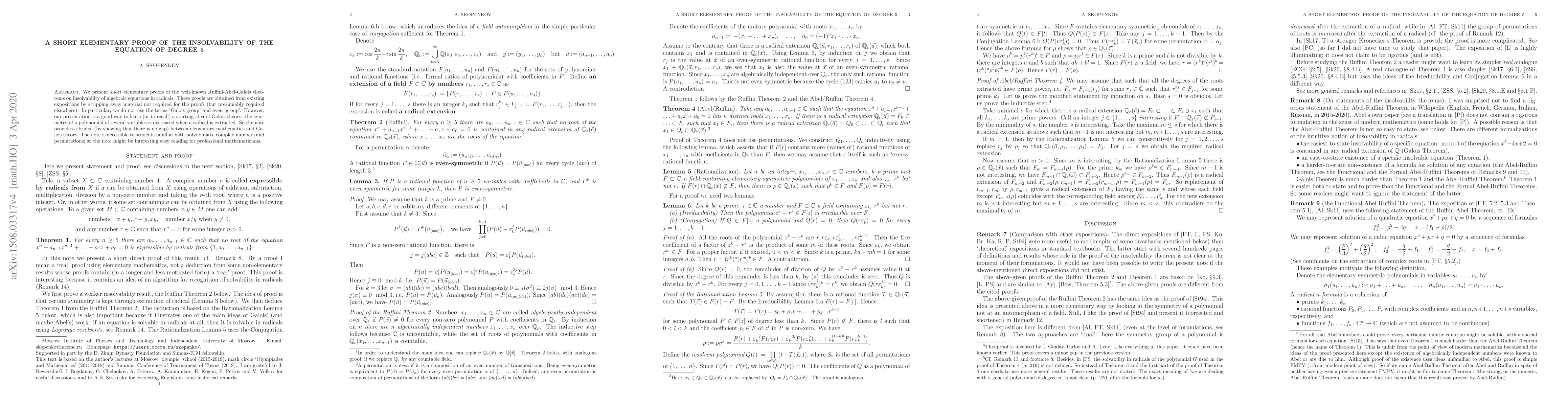 We present short elementary proofs of the well-known Ruffini-Abel-Galois theorems on insolvability of algebraic equations in radicals. These proofs are obtained from existing expositions by stripping away material not required for the proofs (but presumably required elsewhere). In particular, we do not use the terms `Galois group' and even `group'. However, our presentation is a good way to learn (or to recall) a starting idea of Galois theory: the symmetry of a polynomial of several variables is decreased when a radical is extracted. So the note provides a bridge (by showing that there is no gap) between elementary mathematics and Galois theory. The note is accessible to students familiar with polynomials, complex numbers and permutations; so the note might be interesting easy reading for professional mathematicians.