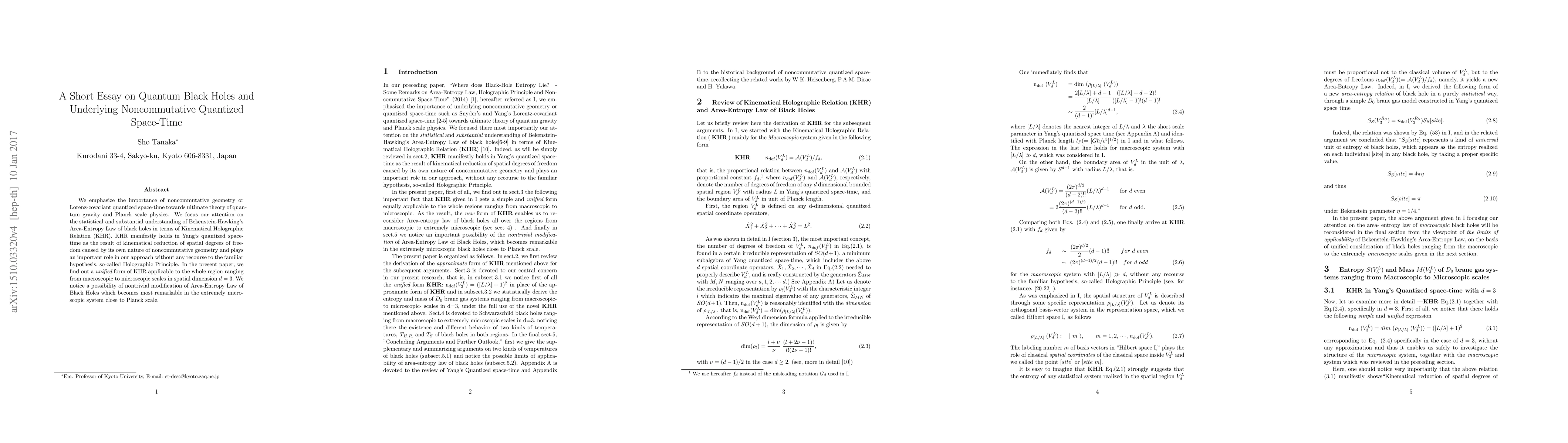 We emphasized the importance of underlying noncommutative geometry or Lorenz-covariant quantized space-time towards ultimate theory of quantum gravity and Planck scale physics. We focused there our attention on the statistical and substantial understanding of Bekenstein-Hawking's Area-Entropy Law of black holes in terms of Kinematical Holographic Relation (KHR). KHR manifestly holds in Yang's quantized space-time as the result of kinematical reduction of spatial degrees of freedom caused by its own nature of noncommutative geometry and plays an important role in our approach without any recourse to the familiar hypothesis, so-called Holographic Principle. In the present paper, we find out a {\it unified} form of KHR applicable to the whole region ranging from macroscopic to microscopic scales in spatial dimension $ d=3.$ We notice a possibility of nontrivial modification of Area-Entropy Law of Black Holes which becomes most remarkable in the extremely microscopic system close to Planck scale. We finally refer to the historical background of noncommutative geometry or quantized space-time.