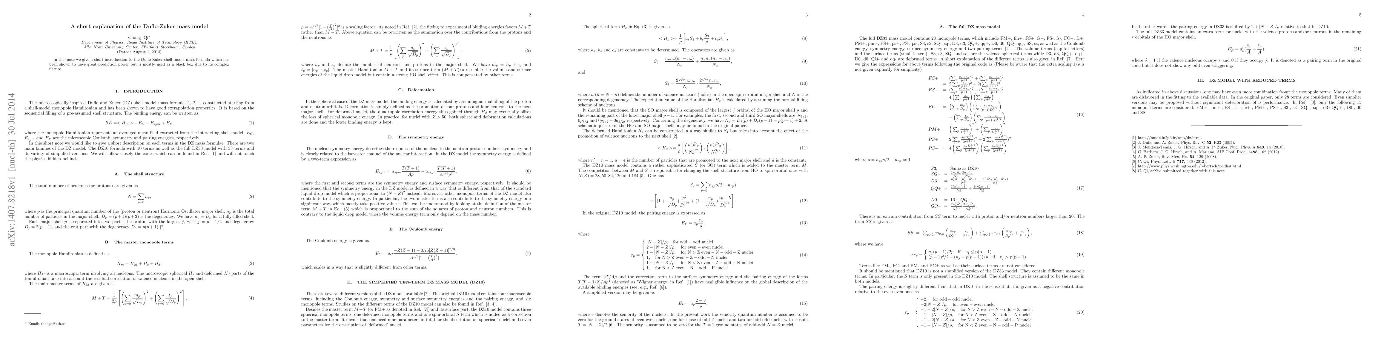 In this note we give a short introduction to the Duflo-Zuker shell model mass formula which has been shown to have great prediction power but is mostly used as a black box due to its complex nature.