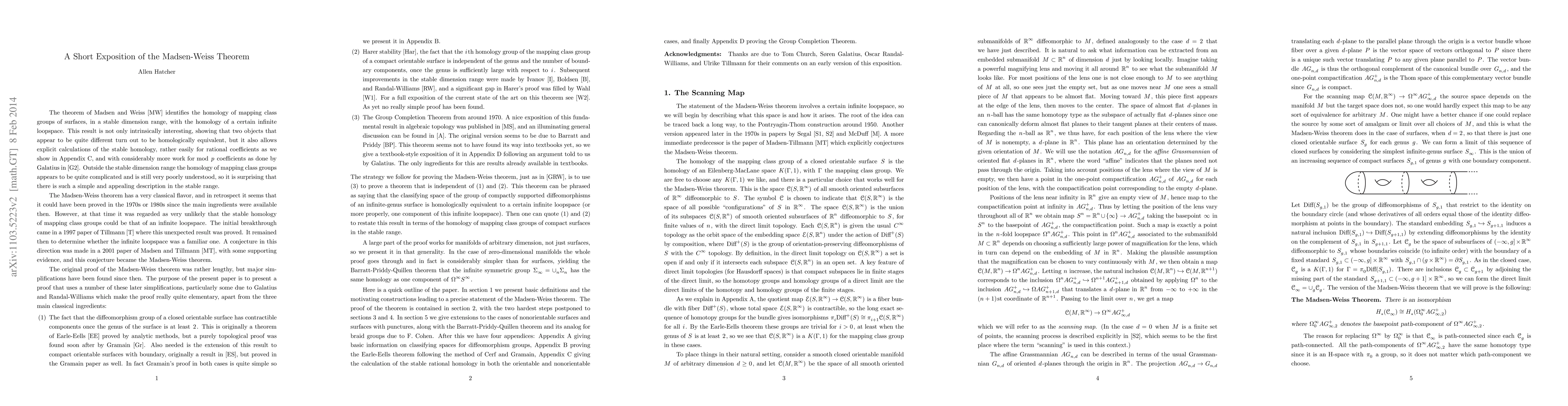 The Madsen-Weiss theorem states that the homology of mapping class groups of surfaces is isomorphic to a specific infinite loopspace, proven using simplifications from Galatius and Randal-Williams.