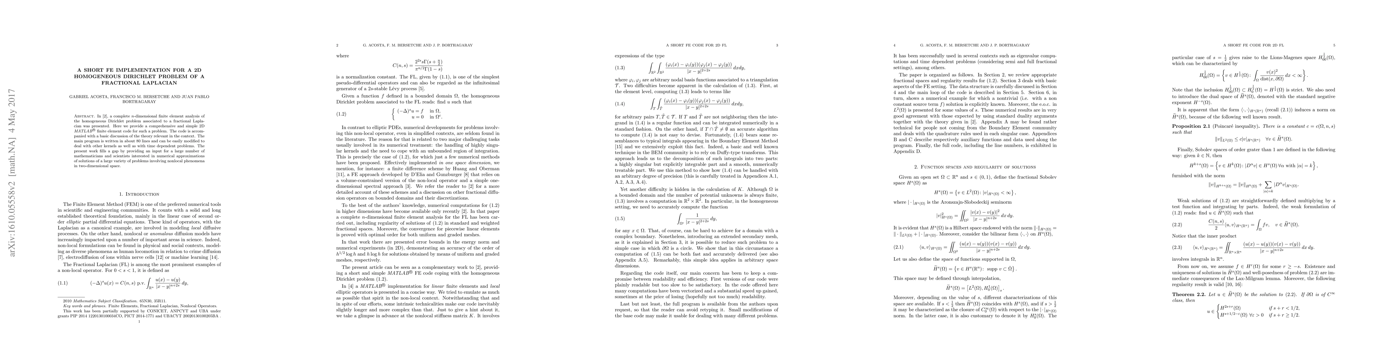 In \cite{AcostaBorthagaray}, a complete $n$-dimensional finite element analysis of the homogeneous Dirichlet problem associated to a fractional Laplacian was presented. Here we provide a comprehensive and simple 2D {\it MATLAB}\textsuperscript{\textregistered} finite element code for such a problem. The code is accompanied with a basic discussion of the theory relevant in the context. The main program is written in about 80 lines and can be easily modified to deal with other kernels as well as with time dependent problems. The present work fills a gap by providing an input for a large number of mathematicians and scientists interested in numerical approximations of solutions of a large variety of problems involving nonlocal phenomena in two-dimensional space.