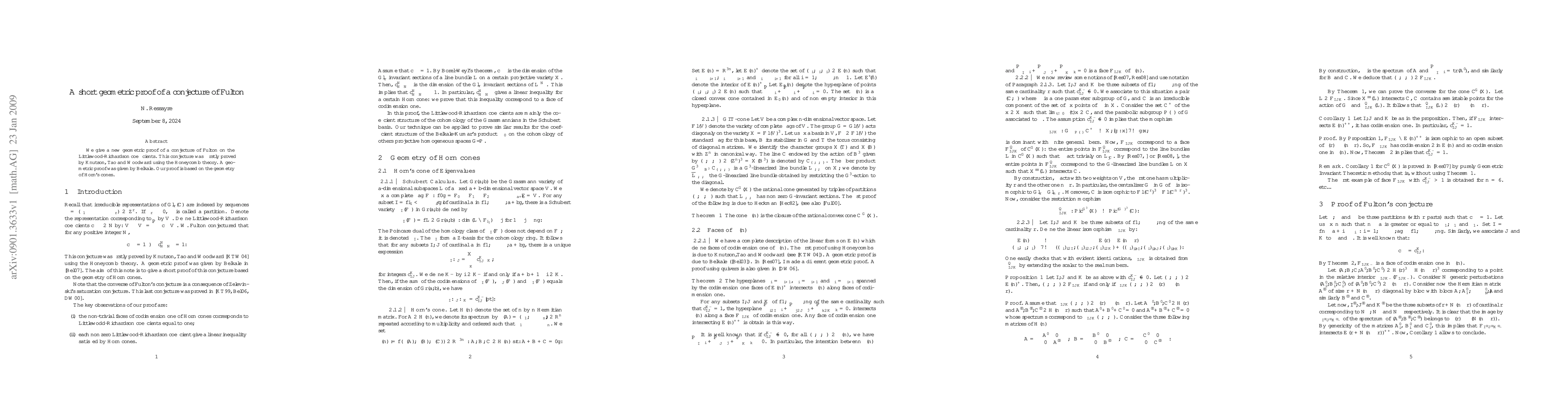 This paper presents a novel geometric proof of Fulton's conjecture on Littlewood-Richardson coefficients, utilizing the geometry of Horn's cones instead of the previously employed Honeycomb theory or other methods. This work offers an alternative approach beyond the earlier proofs by Knutson, Tao, Woodward, and Belkale.