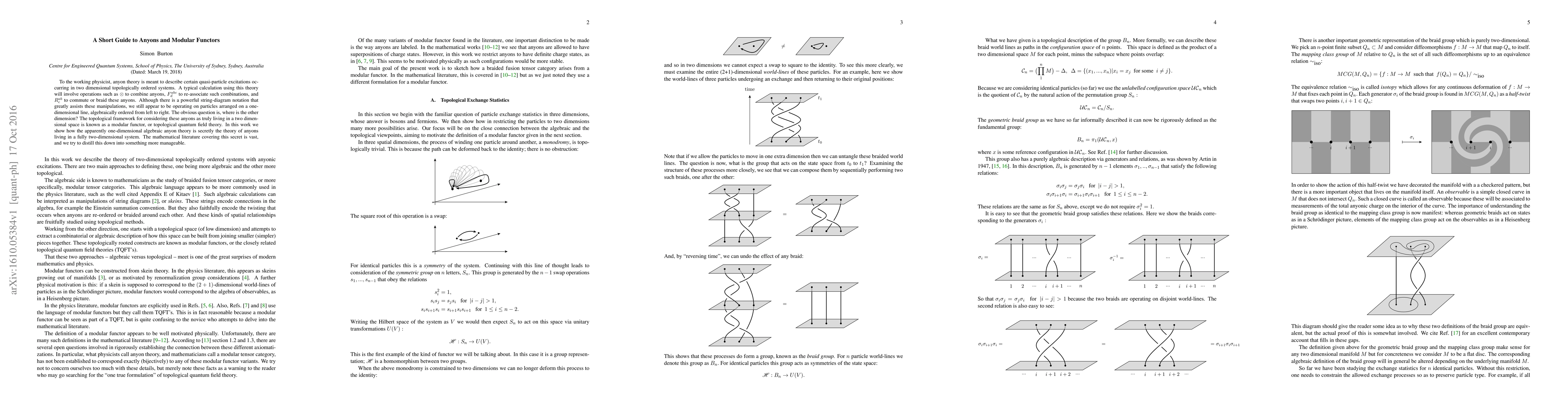 To the working physicist, anyon theory is meant to describe certain quasi-particle excitations occurring in two dimensional topologically ordered systems. A typical calculation using this theory will involve operations such as $\otimes$ to combine anyons, $F^{abc}_{d}$ to re-associate such combinations, and $R^{ab}_c$ to commute or braid these anyons. Although there is a powerful string-diagram notation that greatly assists these manipulations, we still appear to be operating on particles arranged on a one-dimensional line, algebraically ordered from left to right. The obvious question is, where is the other dimension? The topological framework for considering these anyons as truly living in a two dimensional space is known as a modular functor, or topological quantum field theory. In this work we show how the apparently one-dimensional algebraic anyon theory is secretly the theory of anyons living in a fully two-dimensional system. The mathematical literature covering this secret is vast, and we try to distill this down into something more manageable.
