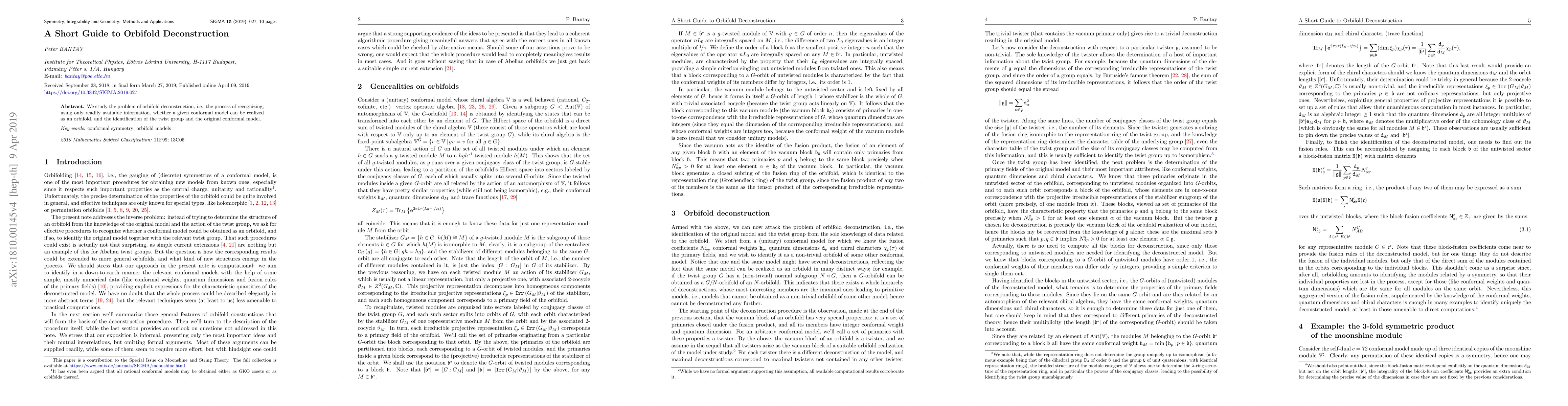 This paper investigates the method of orbifold deconstruction to determine if a given conformal model can be represented as an orbifold, focusing on identifying the twist group and the original model using accessible information.