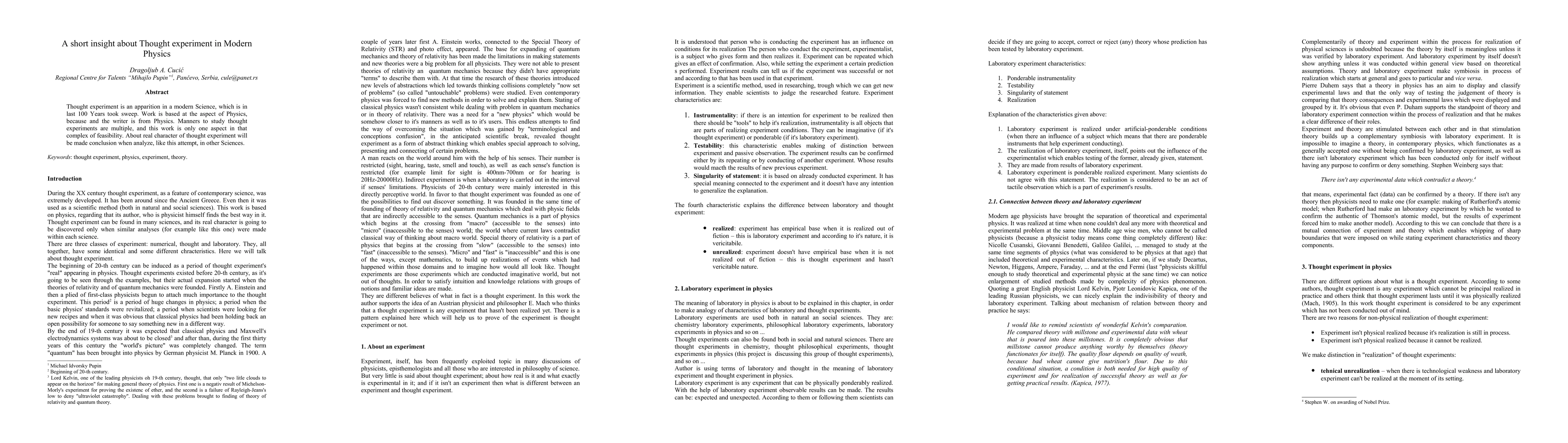Thought experiment is an apparition in a modern Science, which is in last 100 Years took sweep. Work is based at the aspect of Physics, because and the writer is from Physics. Manners to study thought experiments are multiple, and this work is only one aspect in that complex of feasibility. About real character of thought experiment will be made conclusion when analyze, like this attempt, in other Sciences.