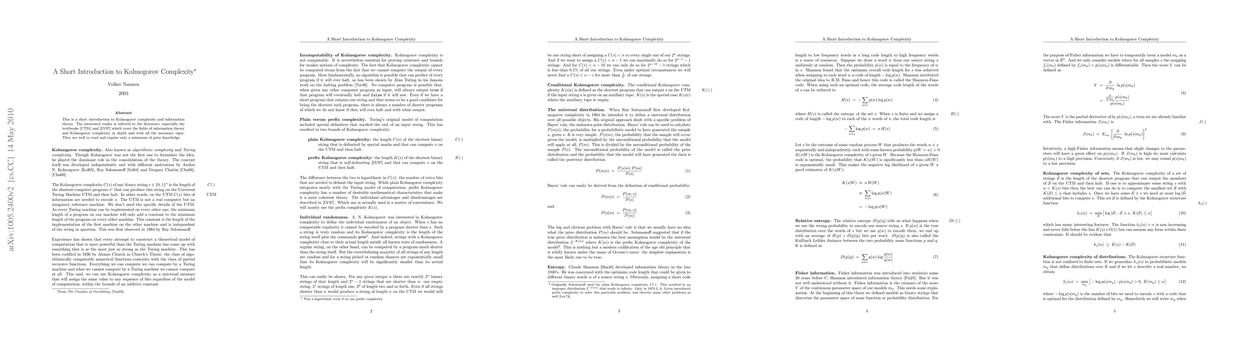 Summary: This brief introduction to Kolmogorov Complexity provides an overview of the concept, directing readers to more comprehensive resources for in-depth study. For rigorous exploration, refer to textbooks by Cover & Thomas and Li & Vitányi.