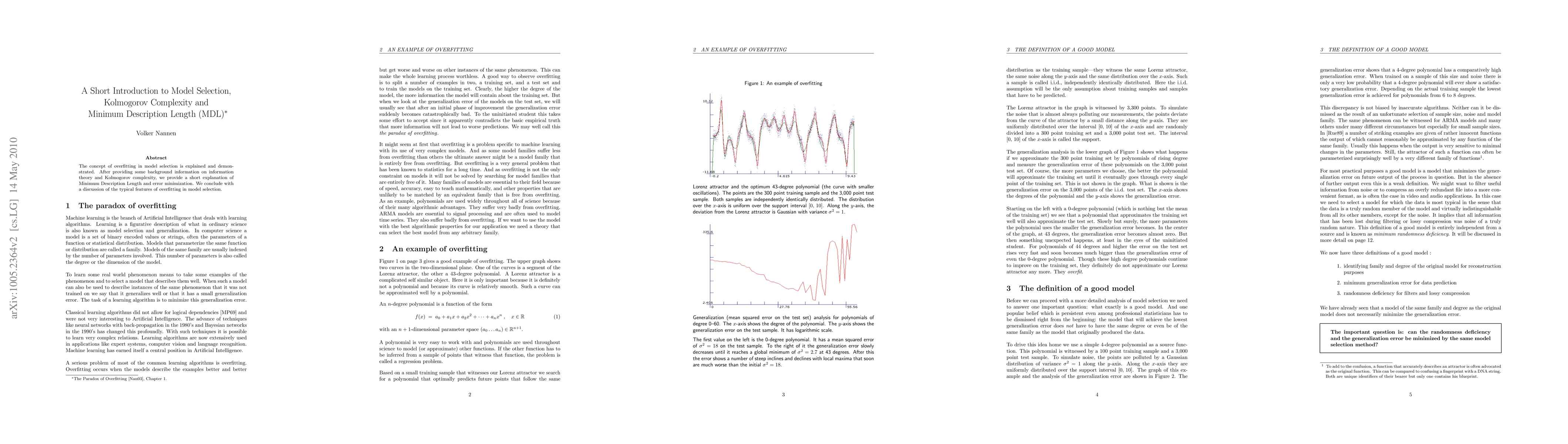 This paper introduces model selection, explaining overfitting with an example, and discusses information theory, Kolmogorov complexity, and Minimum Description Length (MDL) principles for error minimization in model selection. It concludes by highlighting common characteristics of overfitting.