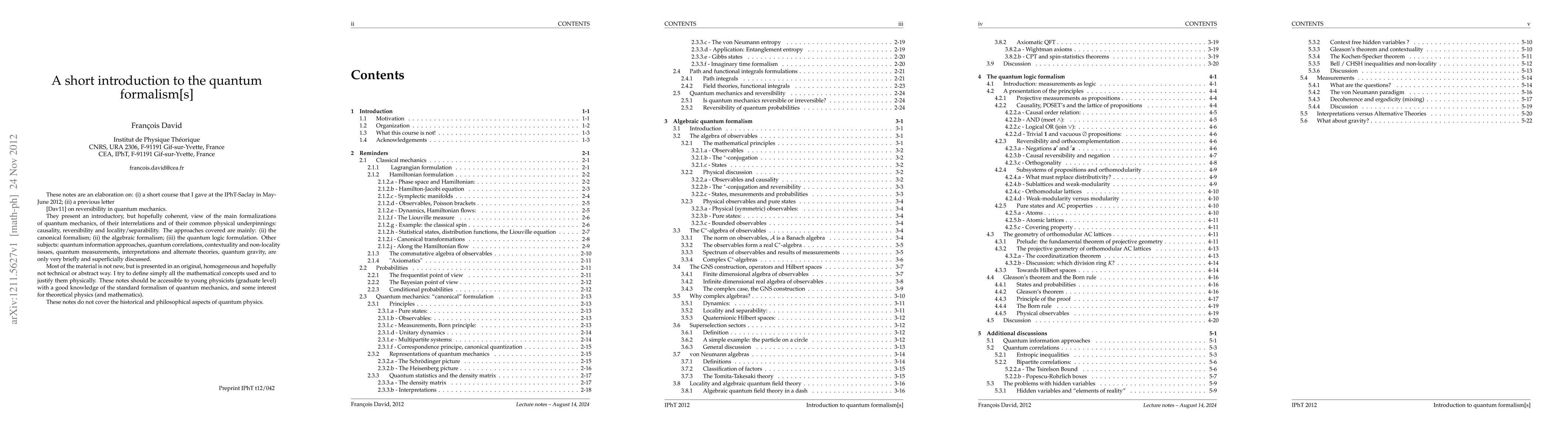 These notes are an elaboration on: (i) a short course that I gave at the IPhT-Saclay in May-June 2012; (ii) a previous letter on reversibility in quantum mechanics. They present an introductory, but hopefully coherent, view of the main formalizations of quantum mechanics, of their interrelations and of their common physical underpinnings: causality, reversibility and locality/separability. The approaches covered are mainly: (ii) the canonical formalism; (ii) the algebraic formalism; (iii) the quantum logic formulation. Other subjects: quantum information approaches, quantum correlations, contextuality and non-locality issues, quantum measurements, interpretations and alternate theories, quantum gravity, are only very briefly and superficially discussed. Most of the material is not new, but is presented in an original, homogeneous and hopefully not technical or abstract way. I try to define simply all the mathematical concepts used and to justify them physically. These notes should be accessible to young physicists (graduate level) with a good knowledge of the standard formalism of quantum mechanics, and some interest for theoretical physics (and mathematics). These notes do not cover the historical and philosophical aspects of quantum physics.