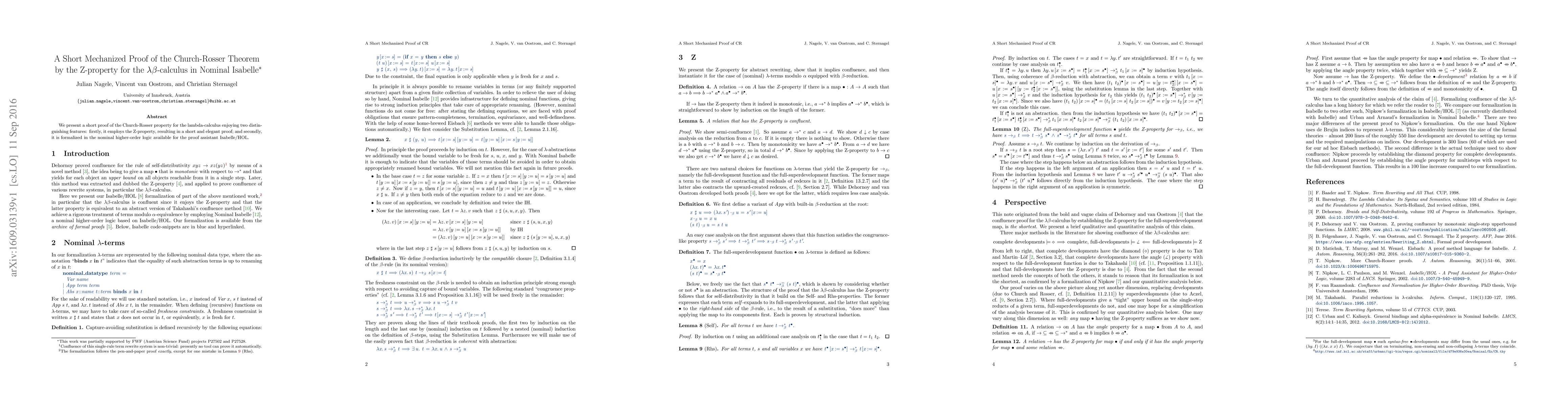 This paper provides a concise mechanized proof of the Church-Rosser theorem for the lambda-calculus using the Z-property, achieving a succinct and elegant result. The proof is formalized in the nominal higher-order logic within the Isabelle/HOL proof assistant.