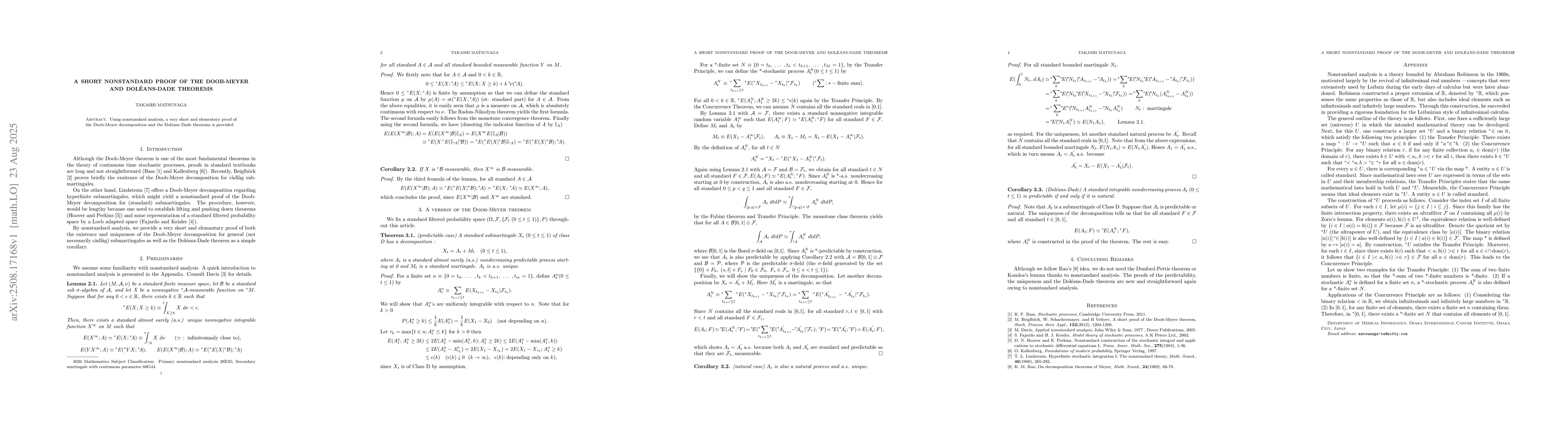 Using nonstandard analysis, a very short and elementary proof of the Doob-Meyer decomposition and the Dol{\'e}ans Dade theorems is provided.