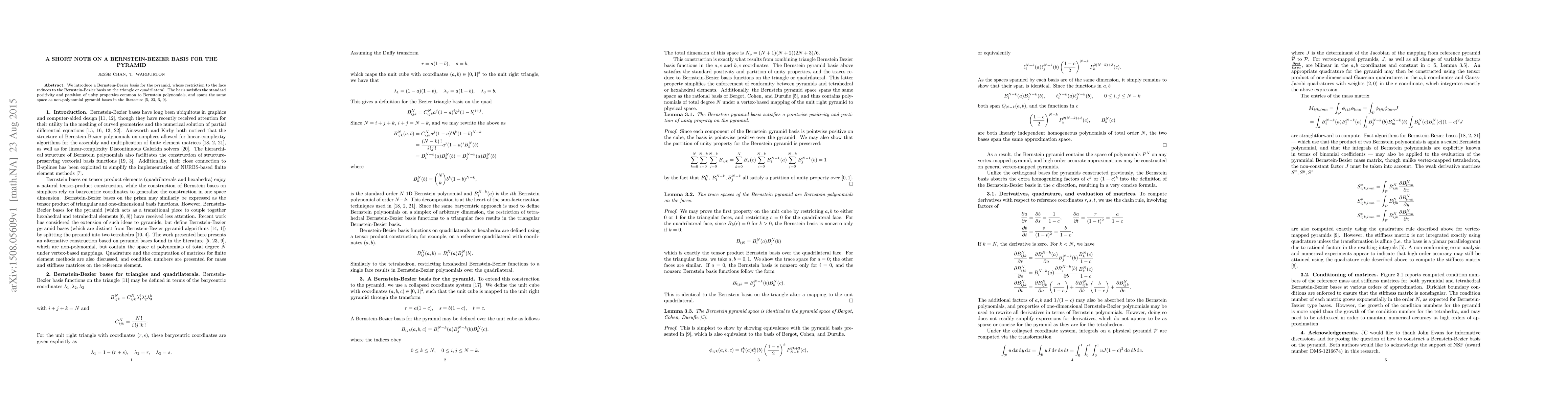 This paper introduces a Bernstein-Bezier basis for pyramids that reduces to the Bernstein-Bezier basis for triangles or quadrilaterals when restricted to the face. It maintains standard properties like positivity and partition of unity, and spans the same space as existing non-polynomial pyramid bases.