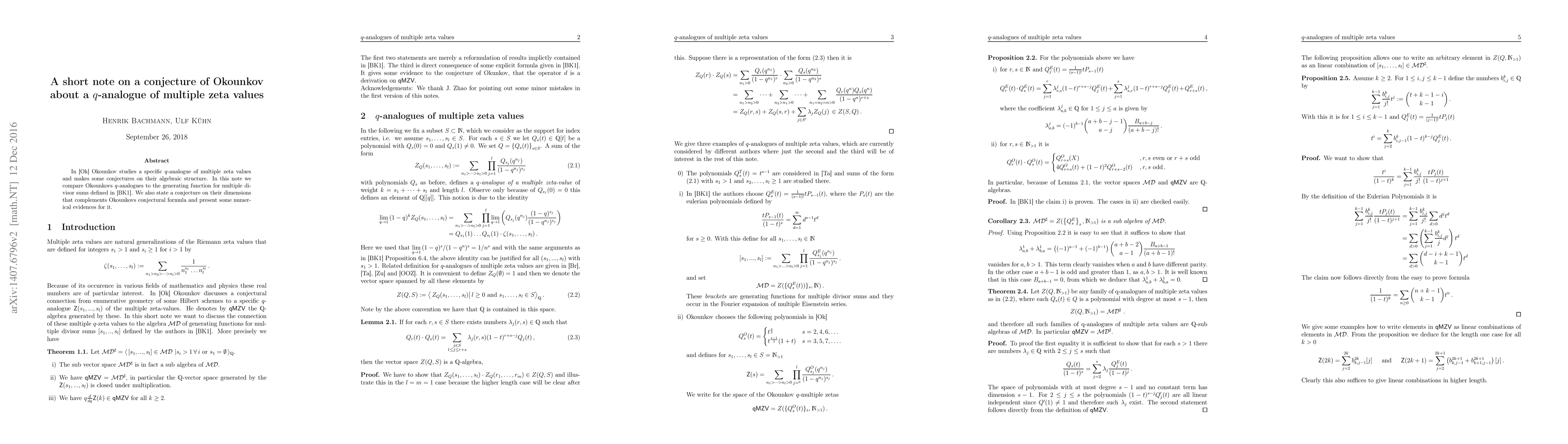 In [Ok] Okounkov studies a specific $q$-analogue of multiple zeta values and makes some conjectures on their algebraic structure. In this note we compare Okounkovs $q$-analogues to the generating function for multiple divisor sums defined in [BK1]. We also state a conjecture on their dimensions that complements Okounkovs conjectural formula and present some numerical evidences for it.