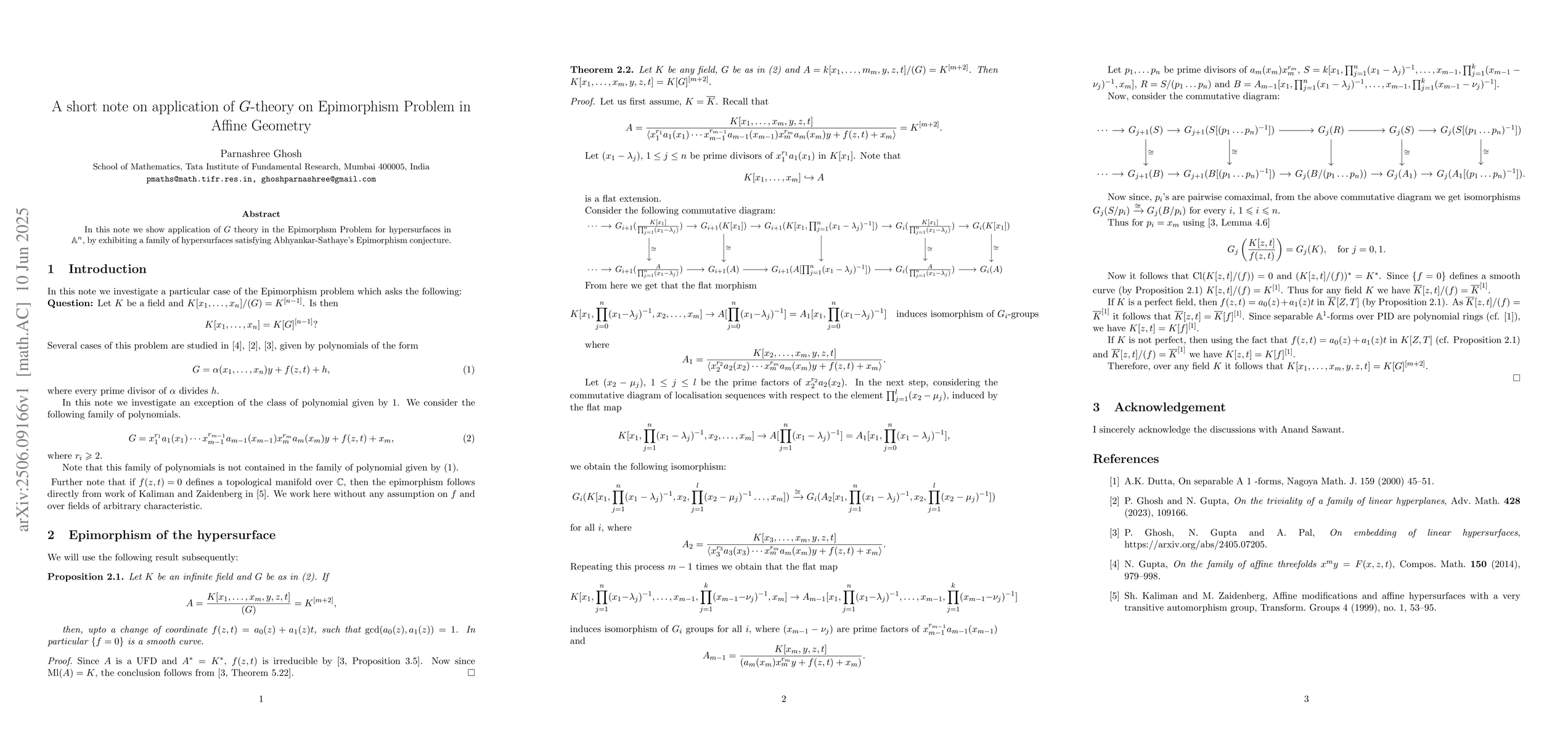 This research note applies G-theory to prove Abhyankar-Sathaye's Epimorphism conjecture for hypersurfaces in affine geometry, providing a new perspective on the problem.