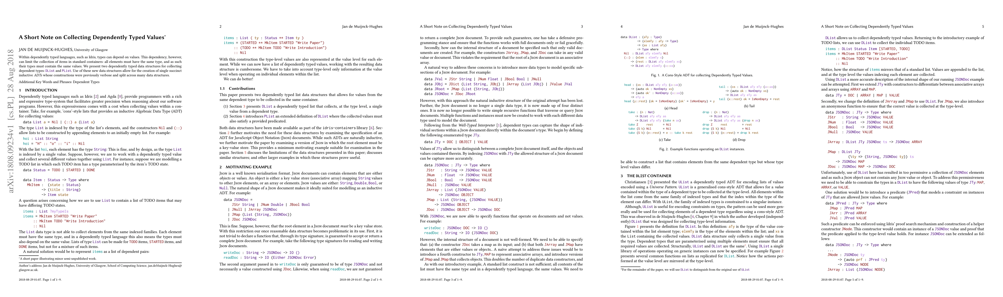 This paper introduces \texttt{DList} and \texttt{PList} data structures in dependently typed languages like Idris, enabling the collection of values where types depend on values, addressing the limitation of standard containers that require uniform type elements. These new structures simplify the creation of inductive abstract data types.