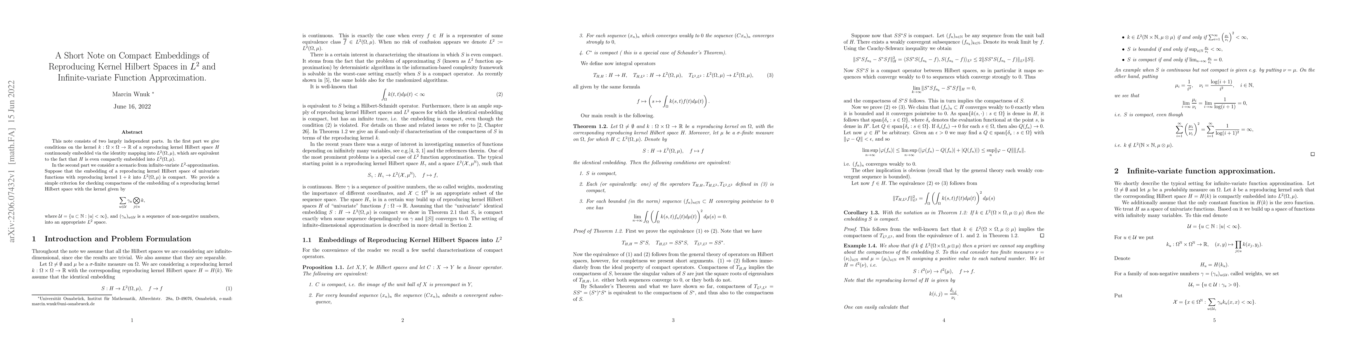 This paper explores conditions for compact embeddings of reproducing kernel Hilbert spaces (RKHS) into $L^2$ spaces, first for finite-variate kernels and then for infinite-variate function approximation scenarios. It provides a criterion for checking the compactness of embeddings for infinite-variate RKHS based on a sum of univariate kernels.