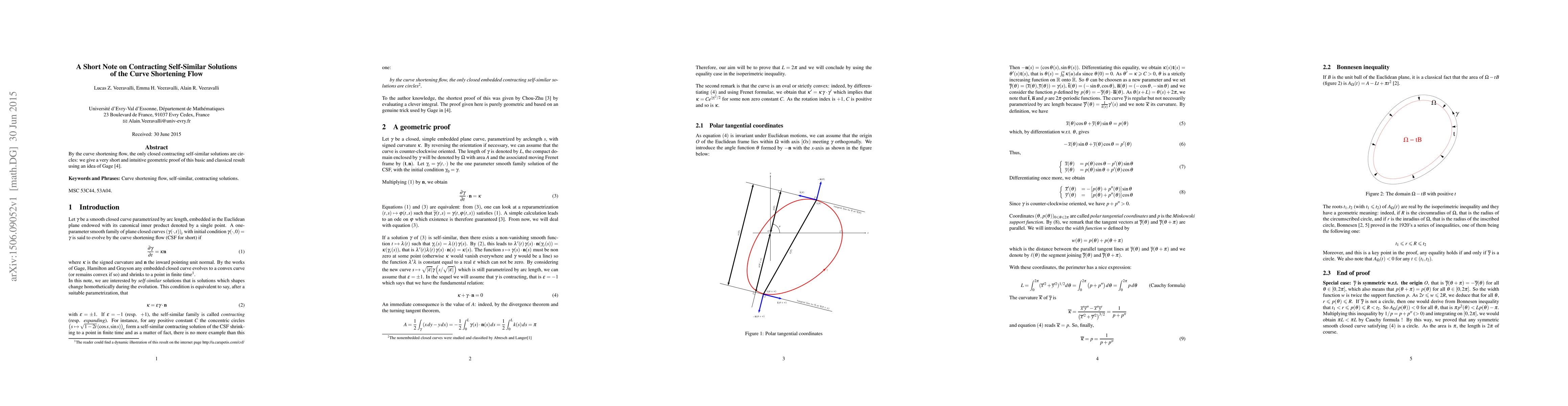 Summary: This paper presents a concise geometric proof that the only closed embedded contracting self-similar solutions to the curve shortening flow are circles, utilizing an intuitive idea from Gage. The result is a fundamental and classical finding in the study of geometric flows.