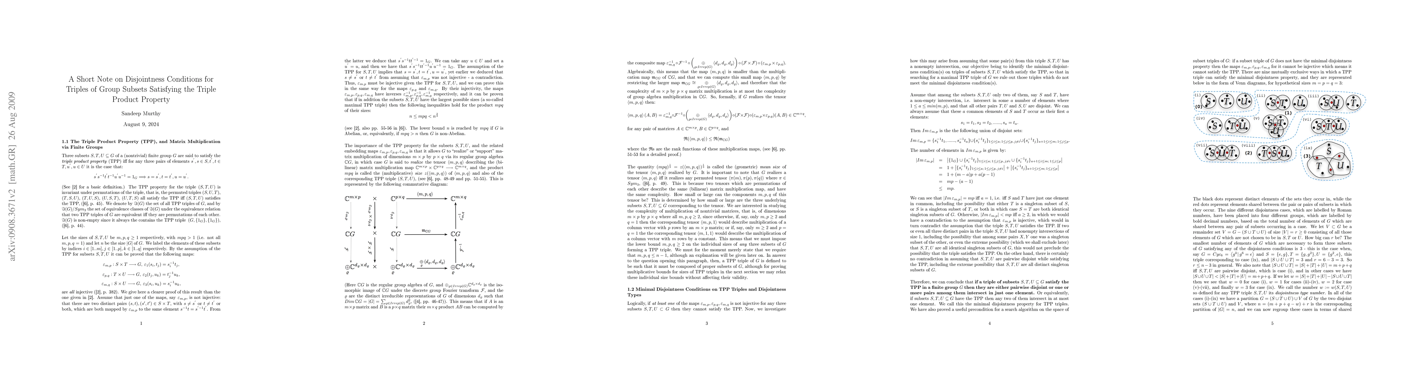 We deduce some elementary pairwise disjointness and semi-disjointness conditions on triples of subsets in arbitrary groups satisfying the so-called triple product property (TPP) as originally defined by H. Cohn and C. Umans in 2003. This property TPP for a triple of group subsets, called a TPP triple, allows the group to "realize" matrix multiplication of dimensions the sizes of the subsets, with the subsets acting as indexing sets for input matrices which are embedded into the regular algebra of the group. We derive nine different disjointness casetypes for an arbitrary TPP triple, and classify these into four different disjointness classes based on an integer measure of the degree of pairwise disjointness among the subsets. Finally, we derive lower and upper bounds for the sum of sizes of the subsets forming a TPP triple, which is the additive equivalent of the multiplicative bounds originally derived by Cohn and Umans for the product of sizes of subsets forming a TPP triple.