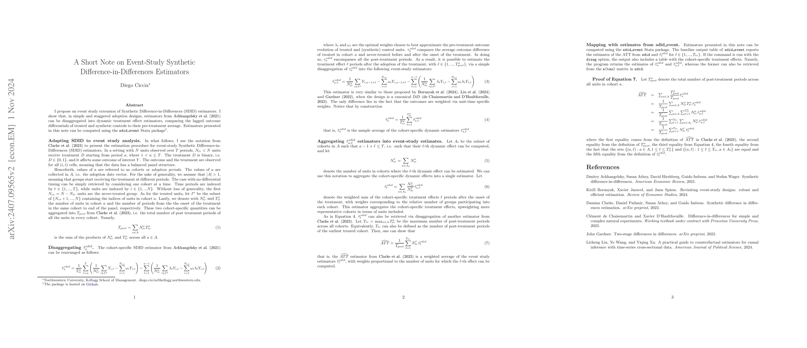 This research proposes an event study extension of Synthetic Difference-in-Differences (SDID) estimators, allowing for dynamic treatment effect estimation in simple and staggered adoption settings by comparing treated groups' lagged outcomes to synthetic controls' pre-treatment averages. The methodology is implemented using the sdid_event Stata package.