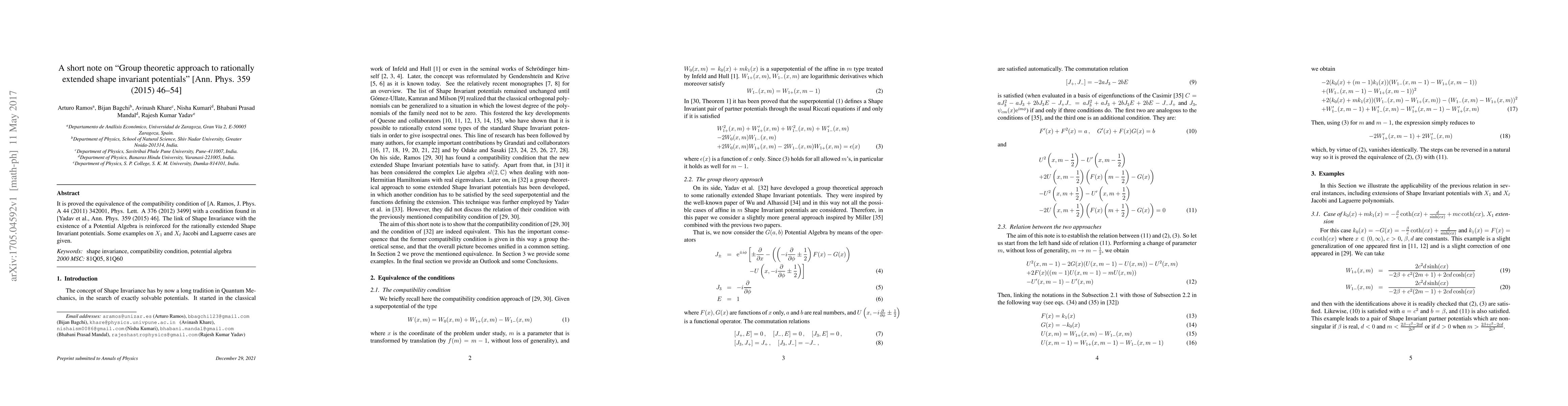 It is proved the equivalence of the compatibility condition of [A. Ramos, J. Phys. A 44 (2011) 342001, Phys. Lett. A 376 (2012) 3499] with a condition found in [Yadav et al., Ann. Phys. 359 (2015) 46]. The link of Shape Invariance with the existence of a Potential Algebra is reinforced for the rationally extended Shape Invariant potentials. Some examples on X1 and Xl Jacobi and Laguerre cases are given.