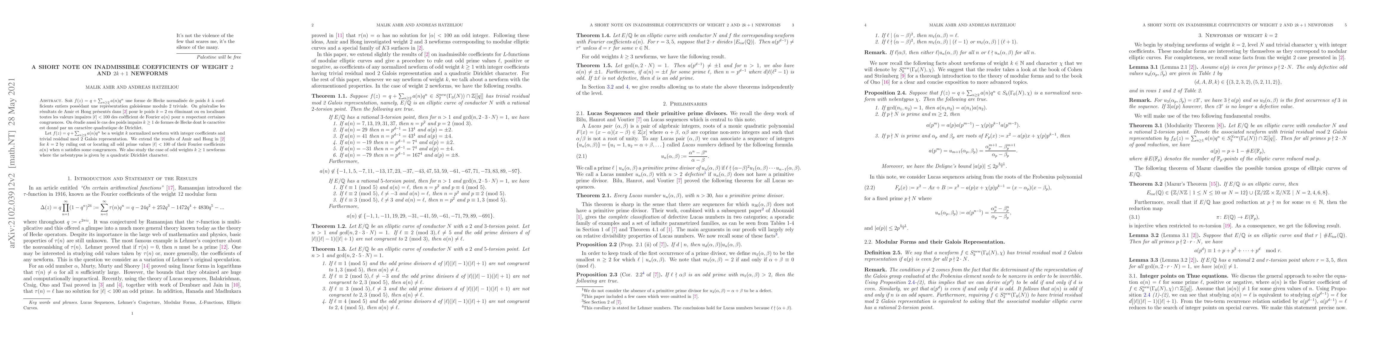 Let $f(z)=q+\sum_{n\geq 2}a(n)q^n$ be a weight $k$ normalized newform with integer coefficients and trivial residual mod 2 Galois representation. We extend the results of Amir and Hong in \cite{AH} for $k=2$ by ruling out or locating all odd prime values $|\ell|<100$ of their Fourier coefficients $a(n)$ when $n$ satisfies some congruences. We also study the case of odd weights $k\geq 1$ newforms where the nebentypus is given by a real quadratic Dirichlet character.