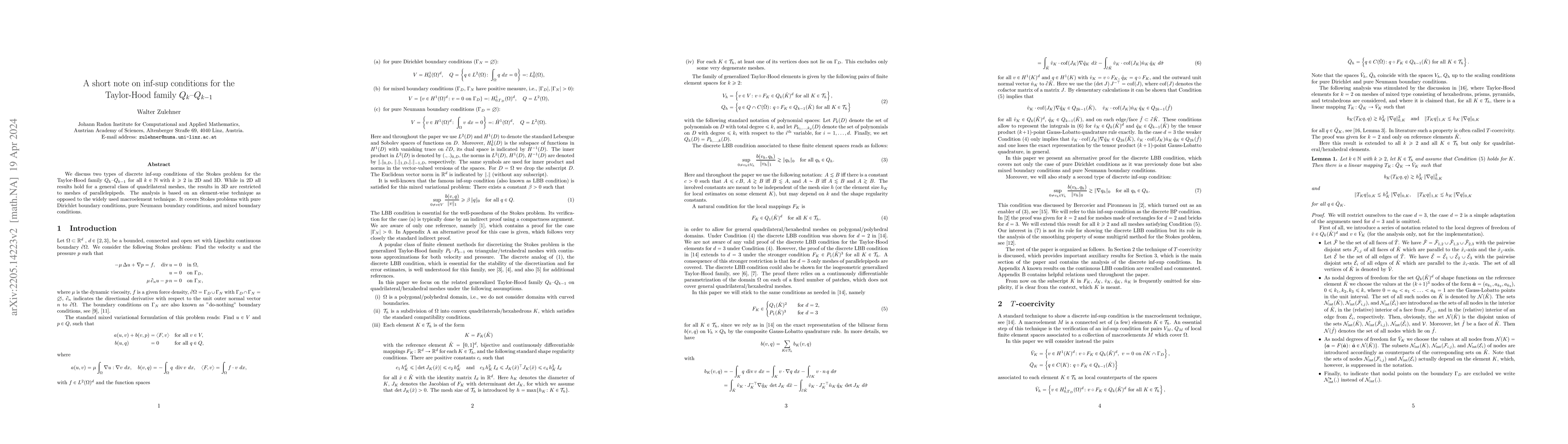 Summary: This study investigates two discrete inf-sup conditions for the Taylor-Hood $Q_k$-$Q_{k-1}$ family in 2D and 3D, employing an element-wise technique. In 2D, conditions apply to general hexahedral meshes, while in 3D, they are limited to parallelepiped meshes.