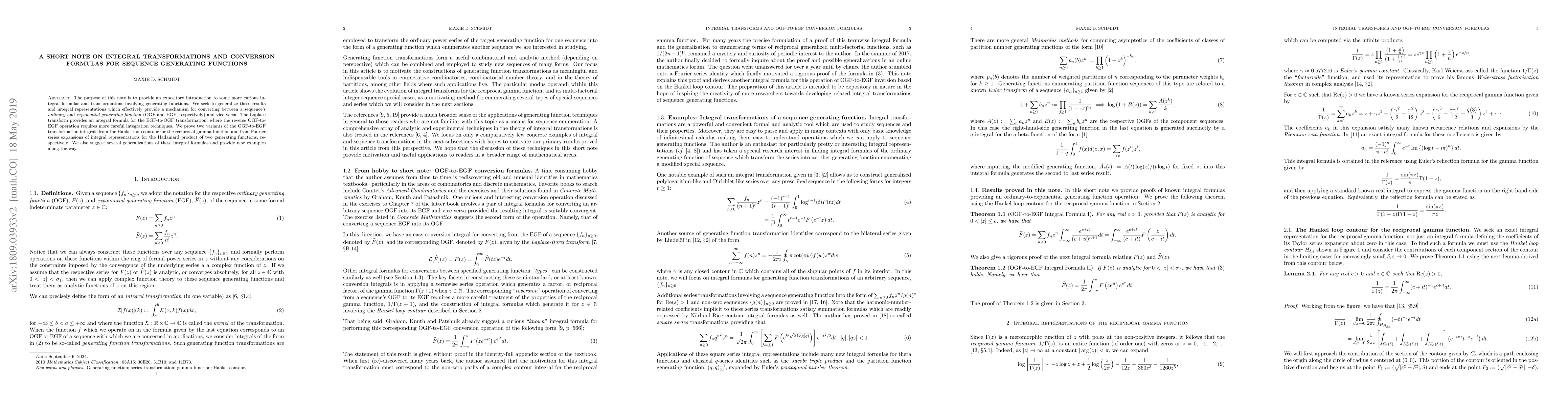 This paper introduces integral transformations and conversion formulas for sequence generating functions, focusing on the Laplace transform for converting between ordinary and exponential generating functions. It also explores two variants of the reverse transformation using Hankel loop contour integration and Fourier series expansions.