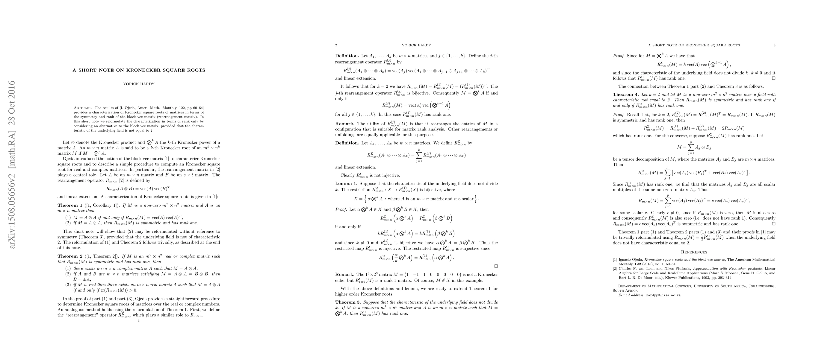 Summary: This paper reformulates the characterization of Kronecker square roots of matrices, originally based on symmetry and rank of a block vec matrix, entirely in terms of rank, using an alternative approach when the field's characteristic is not 2.