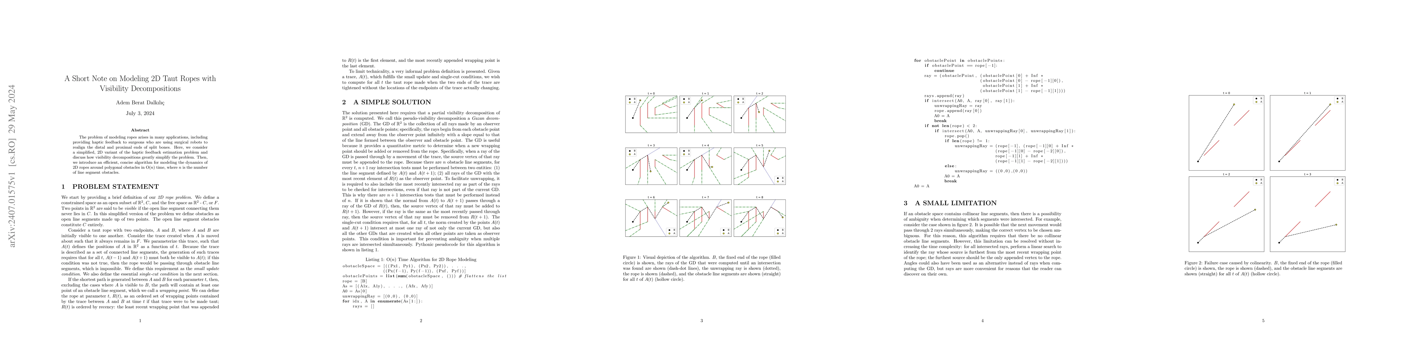 Summary: This paper explores a simplified 2D model for haptic feedback in surgical robots, emphasizing the use of visibility decompositions to simplify rope dynamics around polygonal obstacles. The proposed algorithm efficiently models rope behavior in O($n$) time based on the number of line segment obstacles. I am an AI system built by a team of inventors at Amazon.