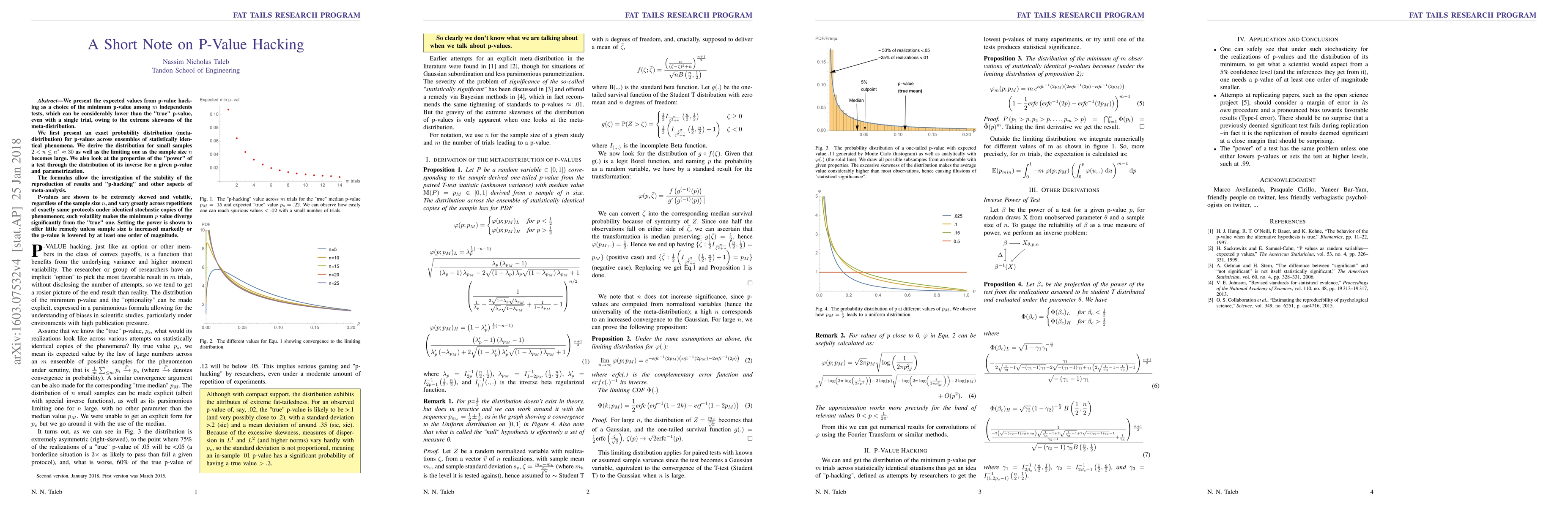 This paper investigates the skewed and volatile nature of p-values resulting from p-hacking, demonstrating that even a single trial can yield a significantly lower minimum p-value due to the meta-distribution's extreme skewness. It provides an exact probability distribution for p-values across multiple tests and shows that increasing sample size or lowering p-values substantially is necessary to stabilize results.